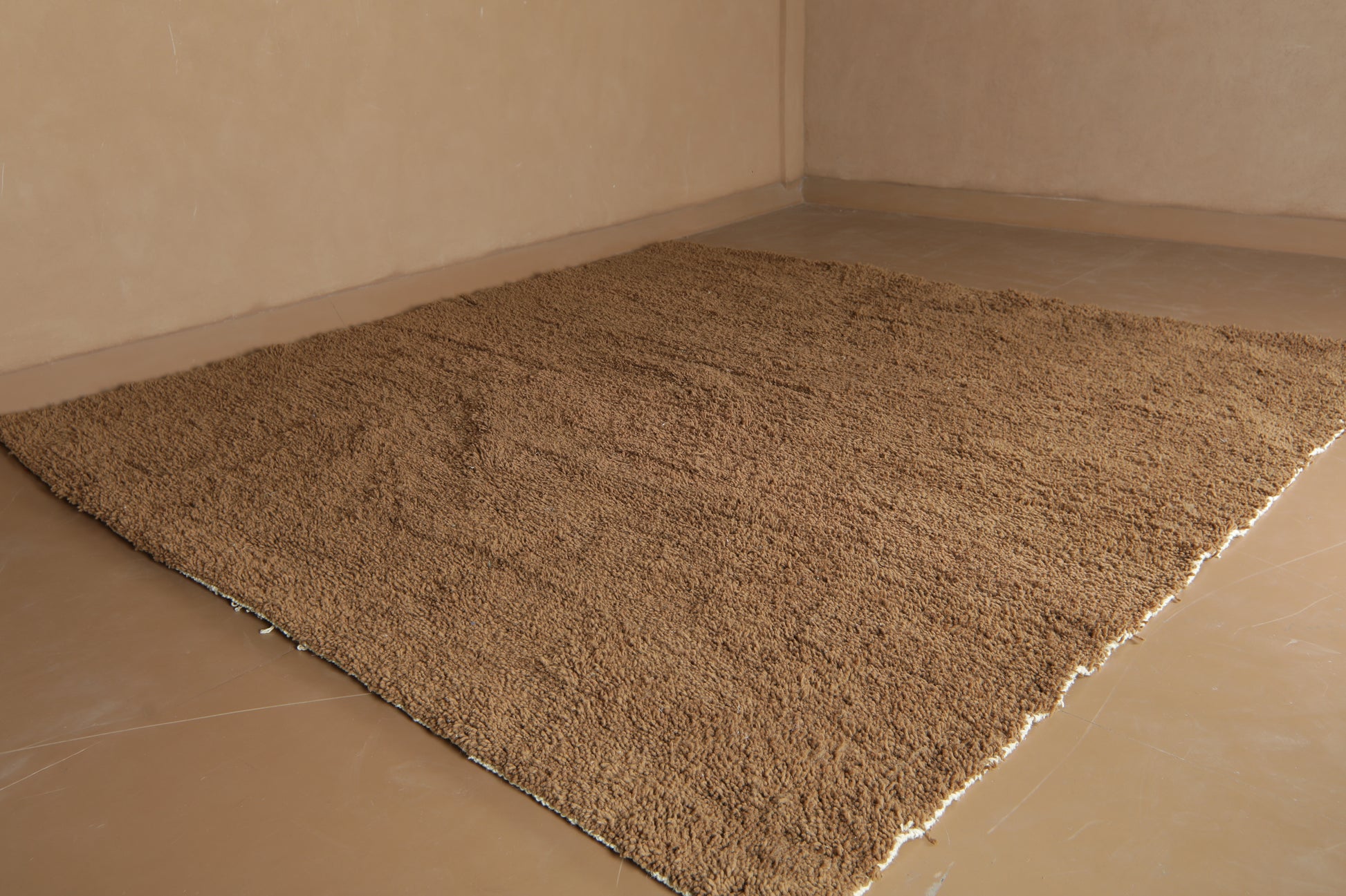 Handcrafted by Amazigh women in the High Atlas Mountains on traditional wooden looms, every piece carries subtle variations that make it truly unique. The solid, earthy color creates a serene foundation perfect for minimalist, modern, or rustic-inspired interiors.