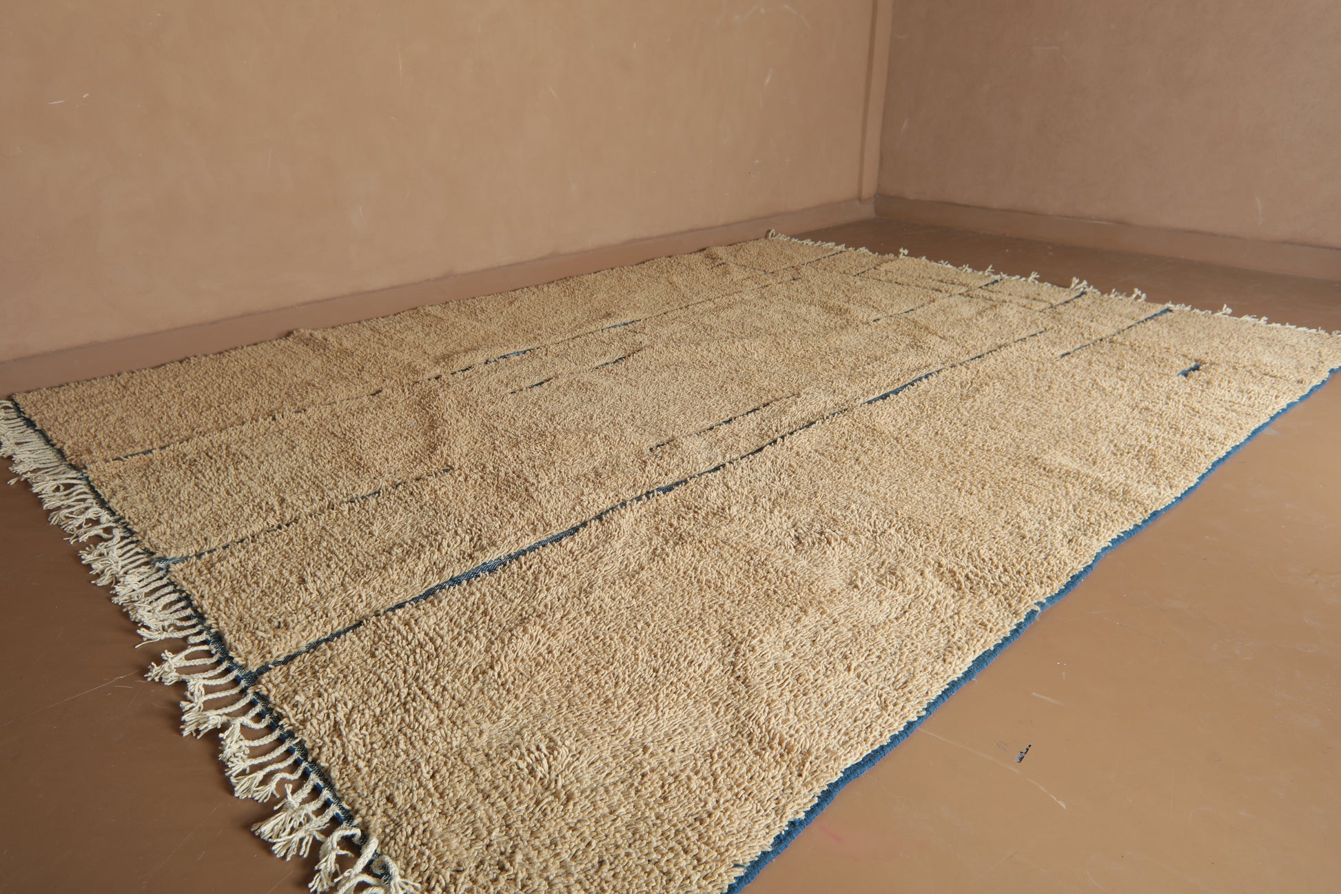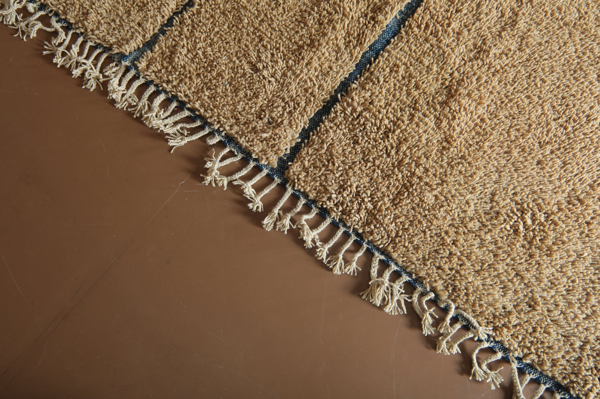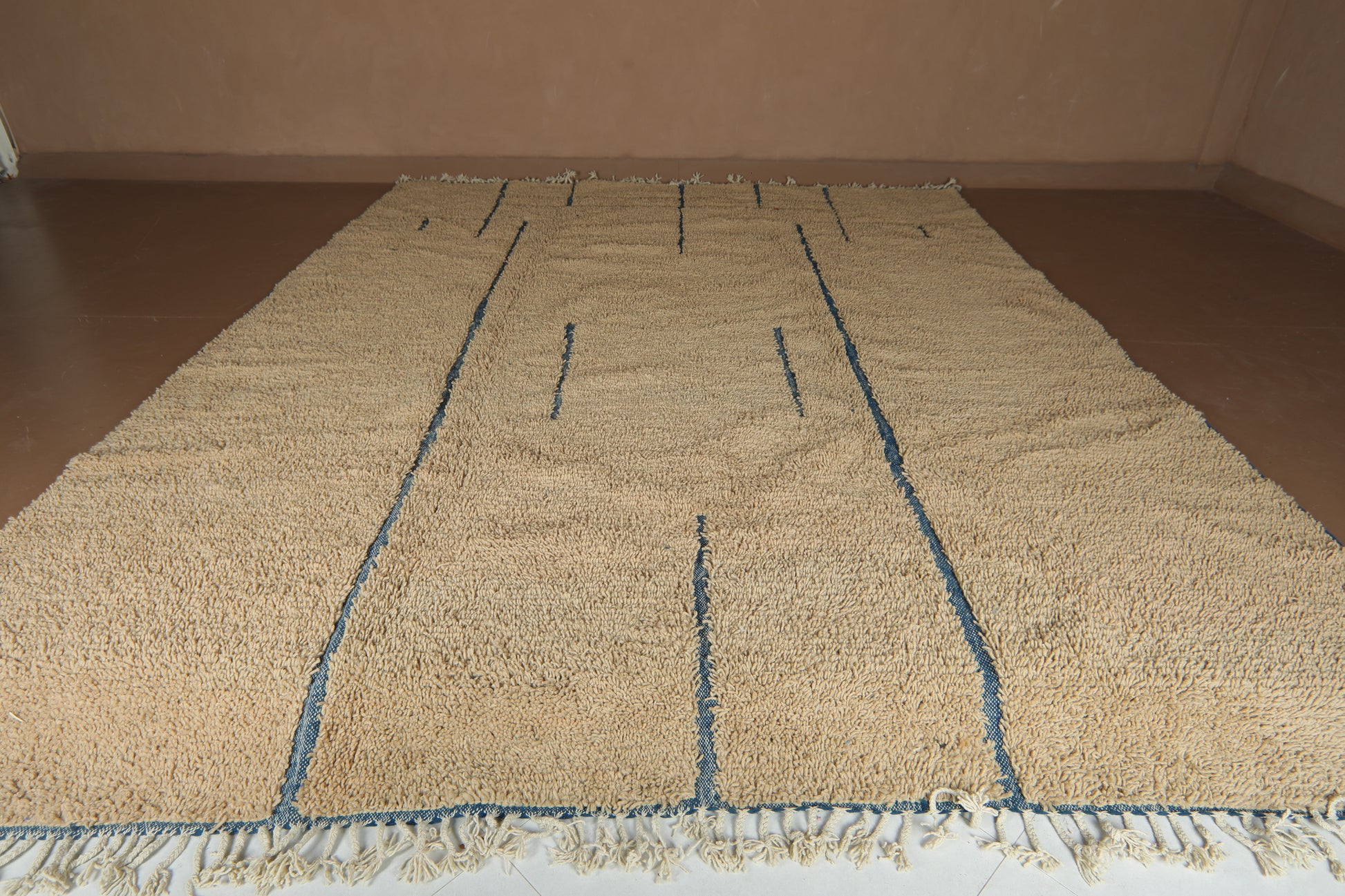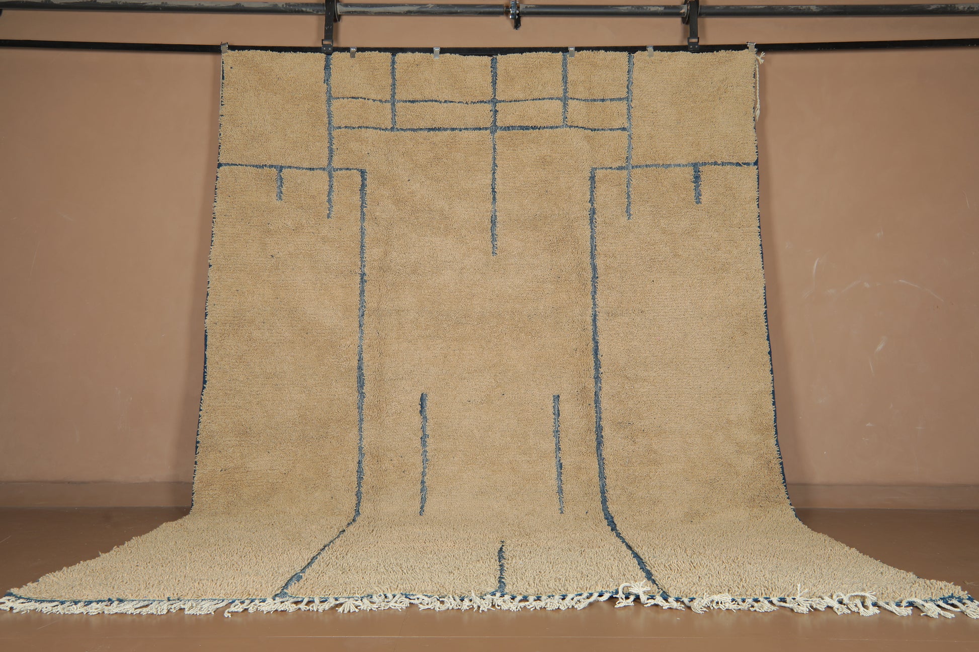 This elegant handmade Moroccan rug combines the warmth of natural beige wool with subtle blue linear accents for a modern, minimalist touch. Crafted from 100% genuine Moroccan wool, it brings a cozy yet sophisticated aesthetic to your space — perfect for both contemporary and traditional interiors.