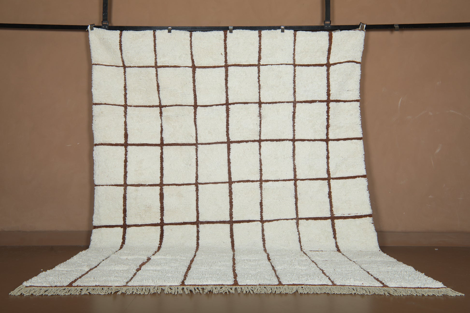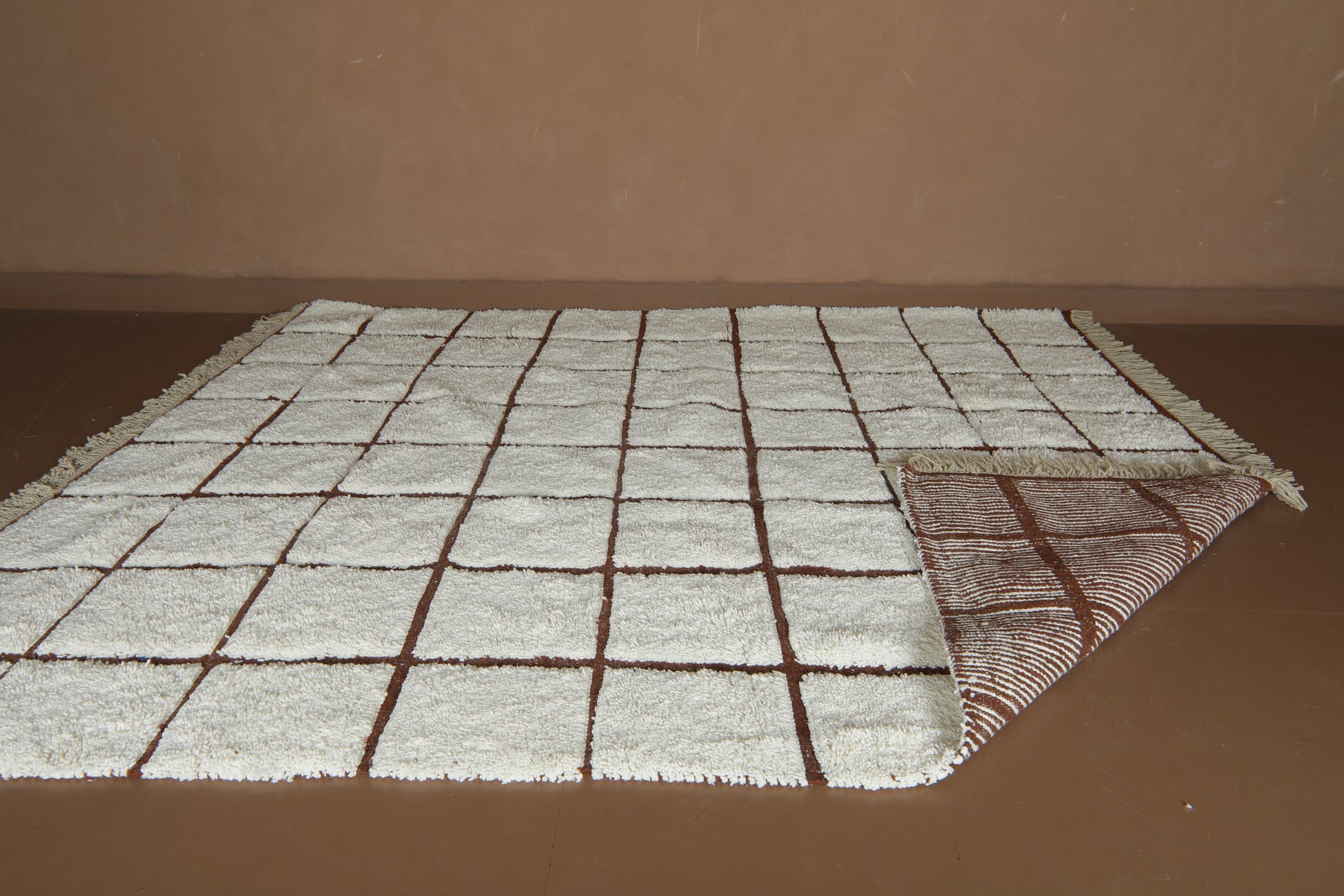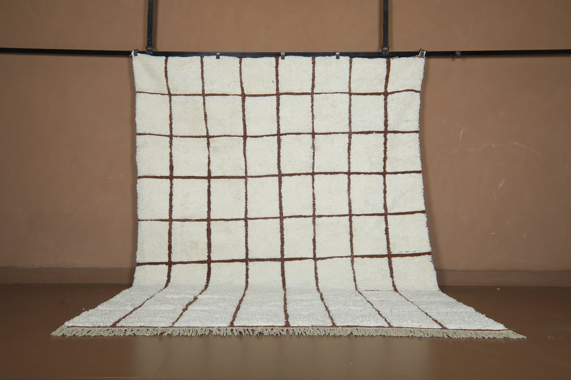 This stunning handmade Moroccan rug features a clean cream base accented with bold brown grid lines, blending traditional Berber craftsmanship with a modern geometric aesthetic. The BASHA rug adds warmth, texture, and sophistication to any room — perfect for minimalist, boho, or contemporary interiors.