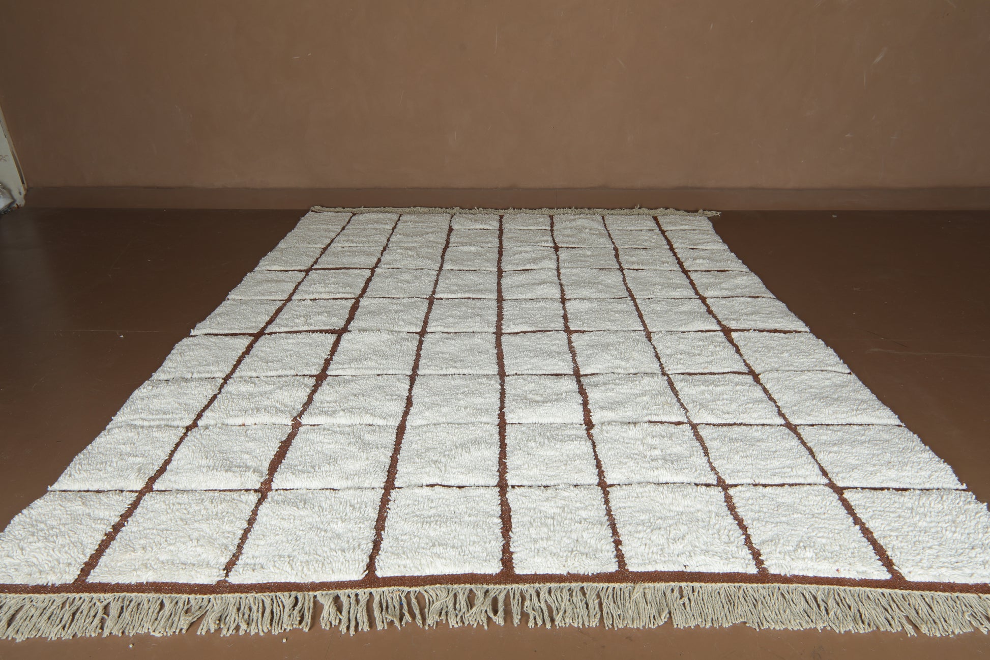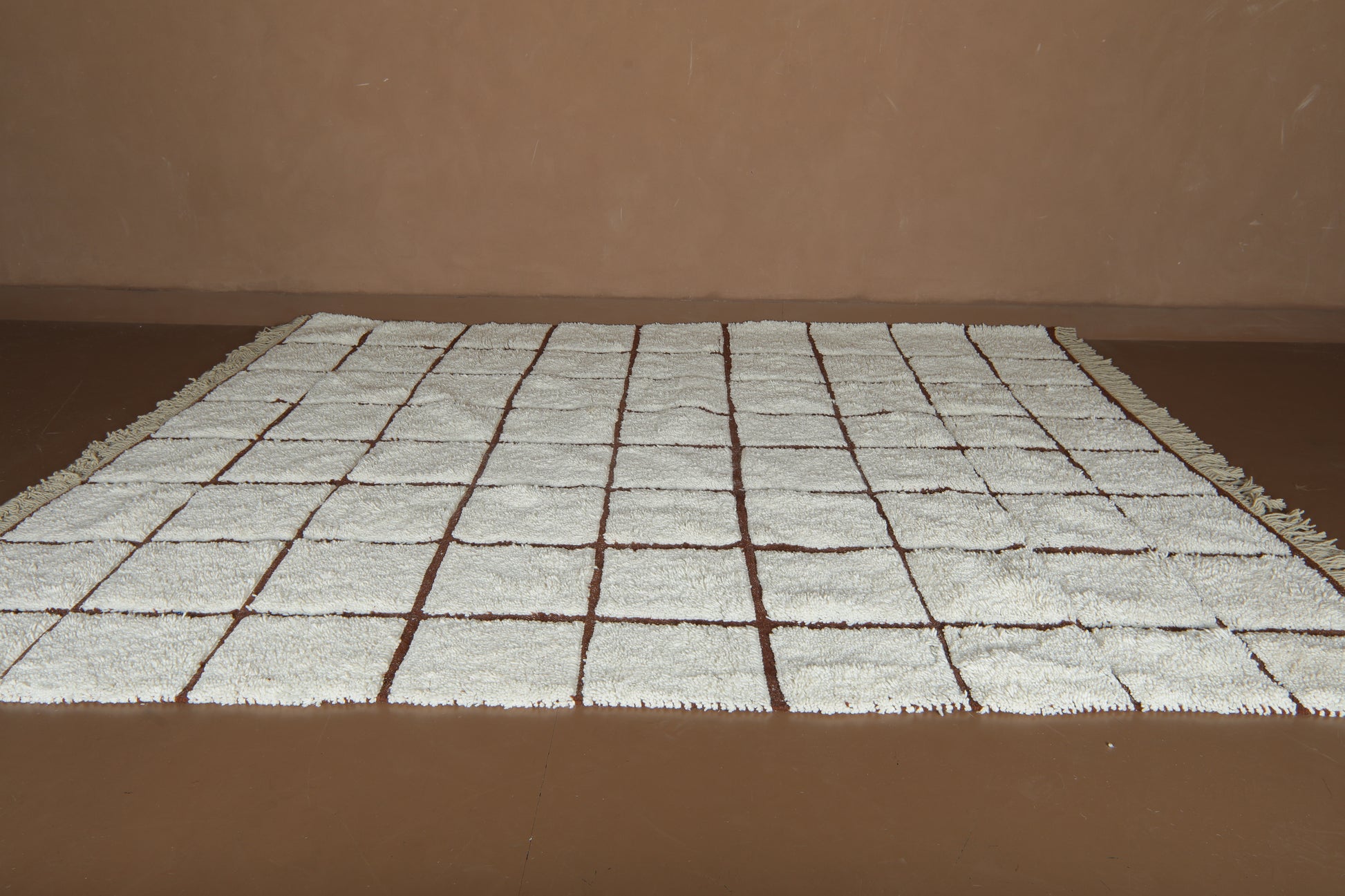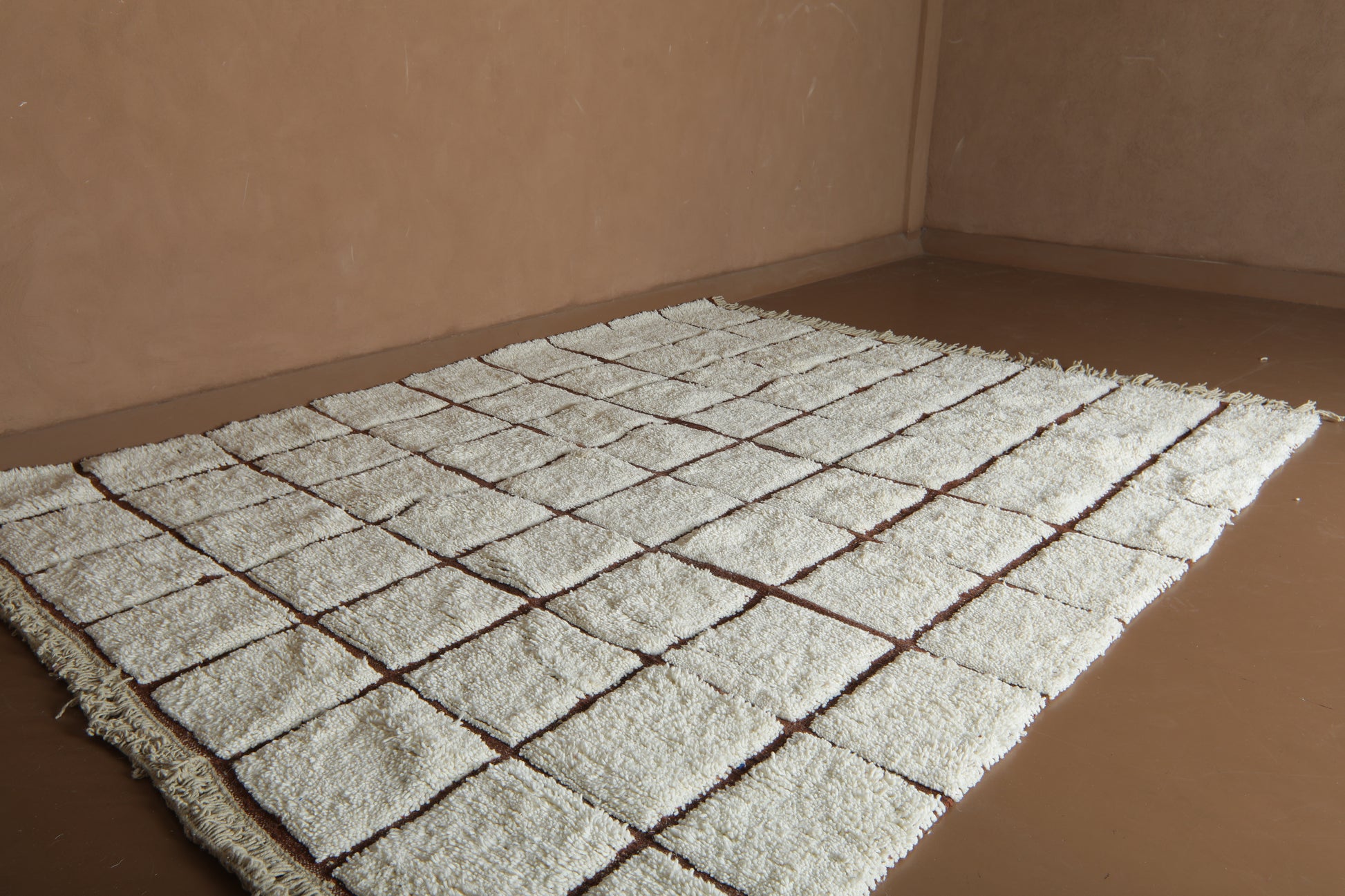 This stunning handmade Moroccan rug features a clean cream base accented with bold brown grid lines, blending traditional Berber craftsmanship with a modern geometric aesthetic. The BASHA rug adds warmth, texture, and sophistication to any room — perfect for minimalist, boho, or contemporary interiors.