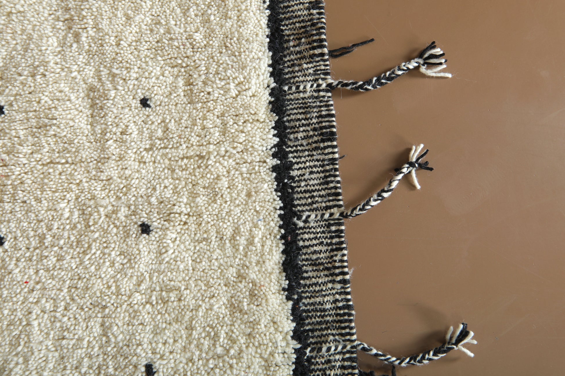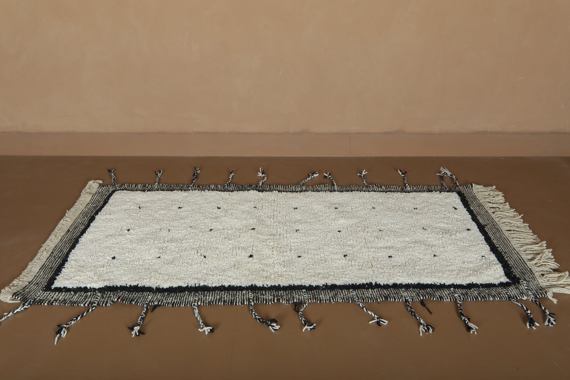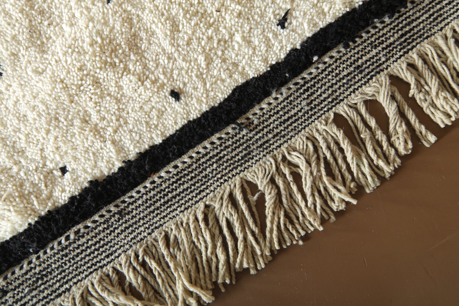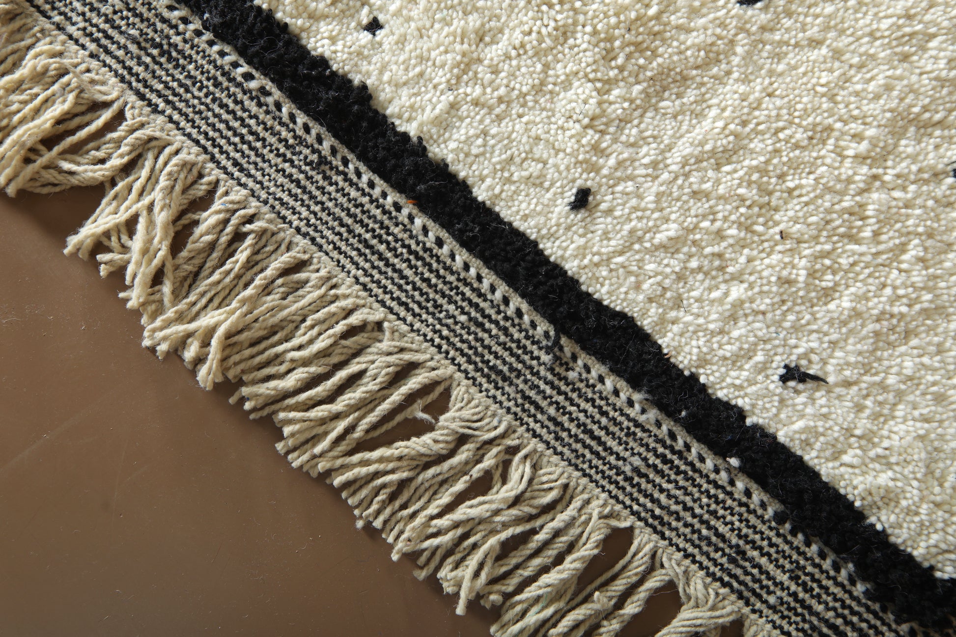 A celebration of Amazigh minimalism, the RUG is a refined statement of Moroccan craft. Its creamy ivory wool field is accented with small, hand-knotted black dots—each one a subtle emblem of tribal symbolism and the artisan’s hand. A bold black border, finished with intricate striped side tassels, frames the composition with graphic clarity.