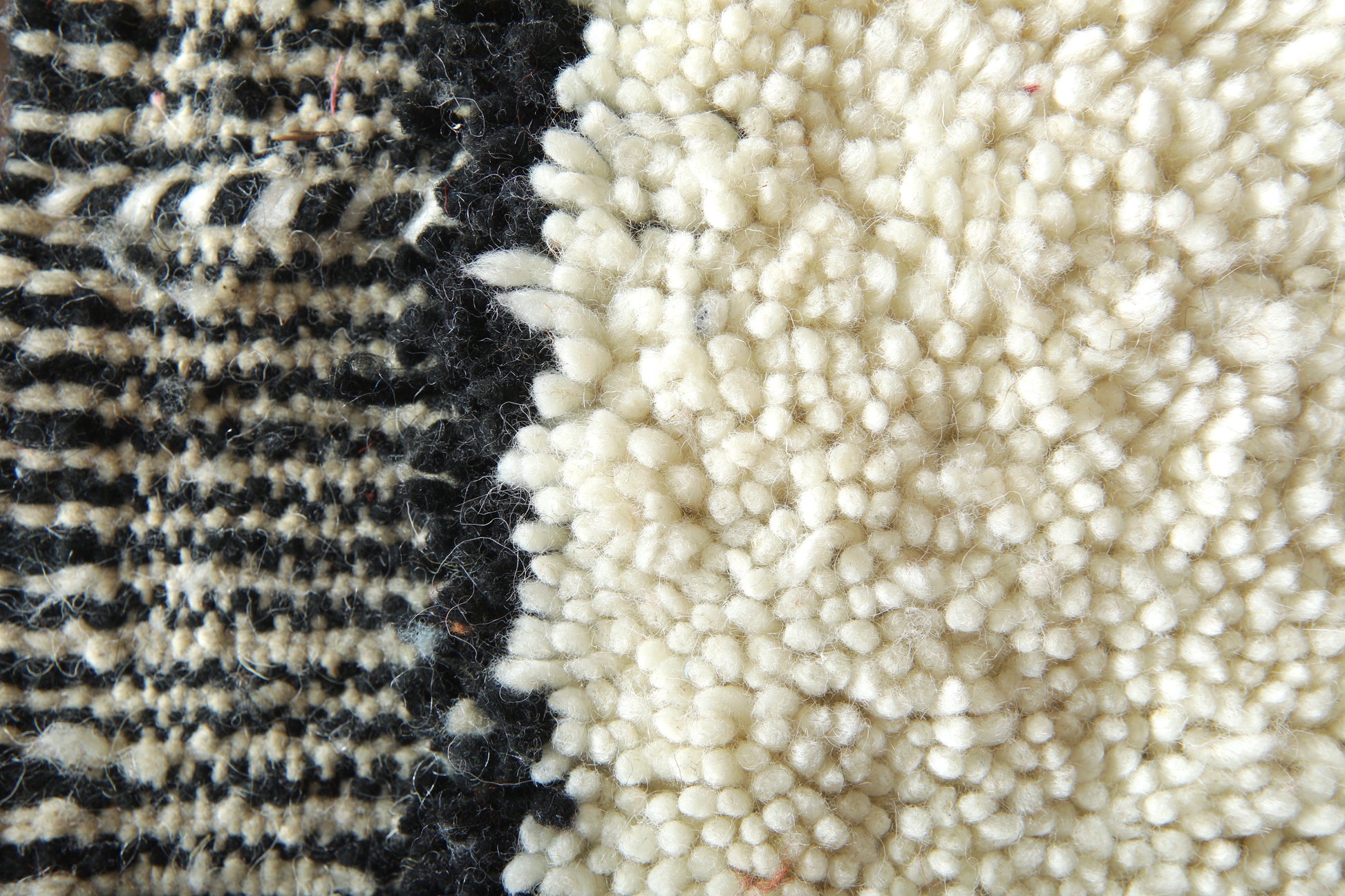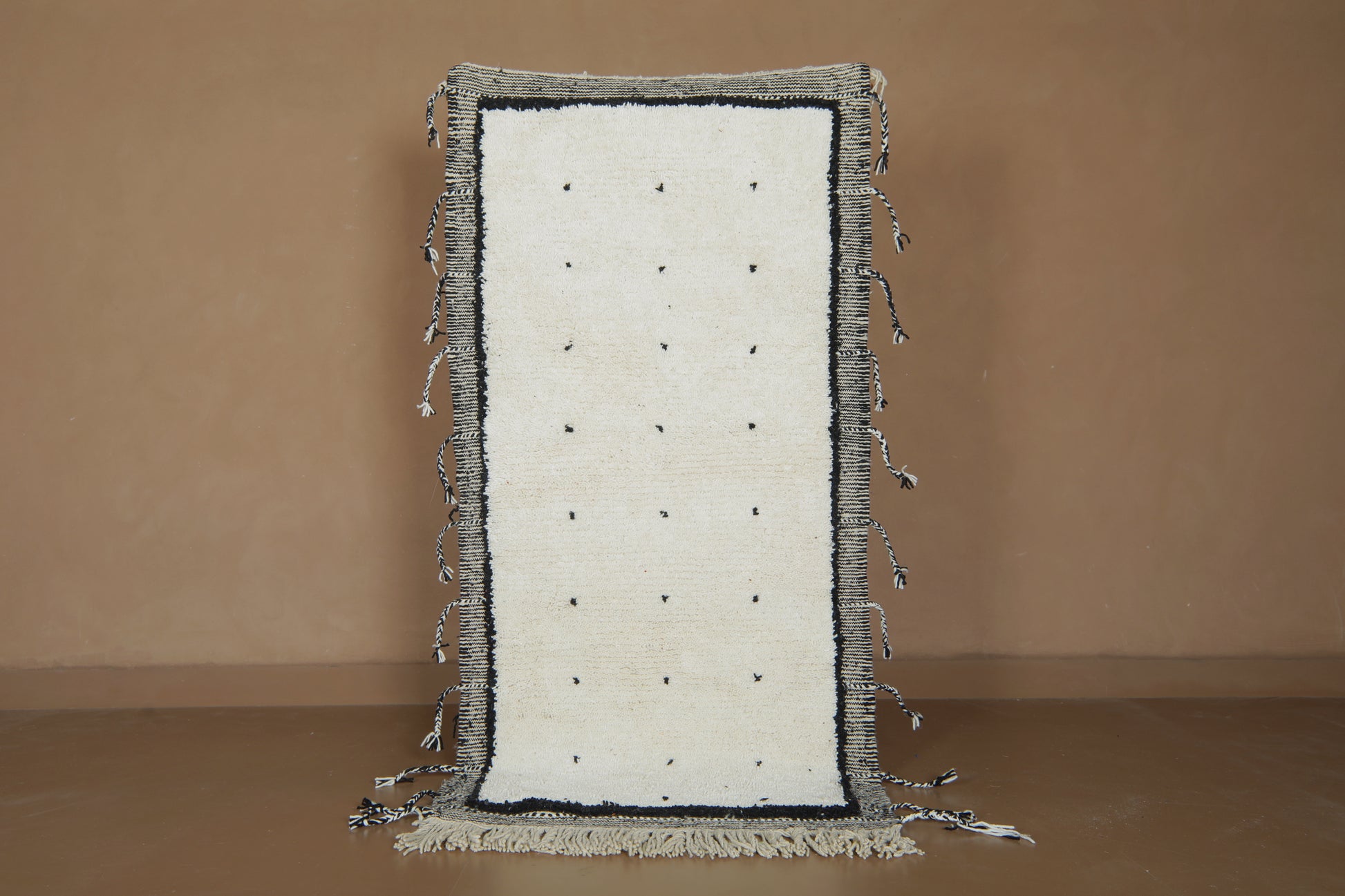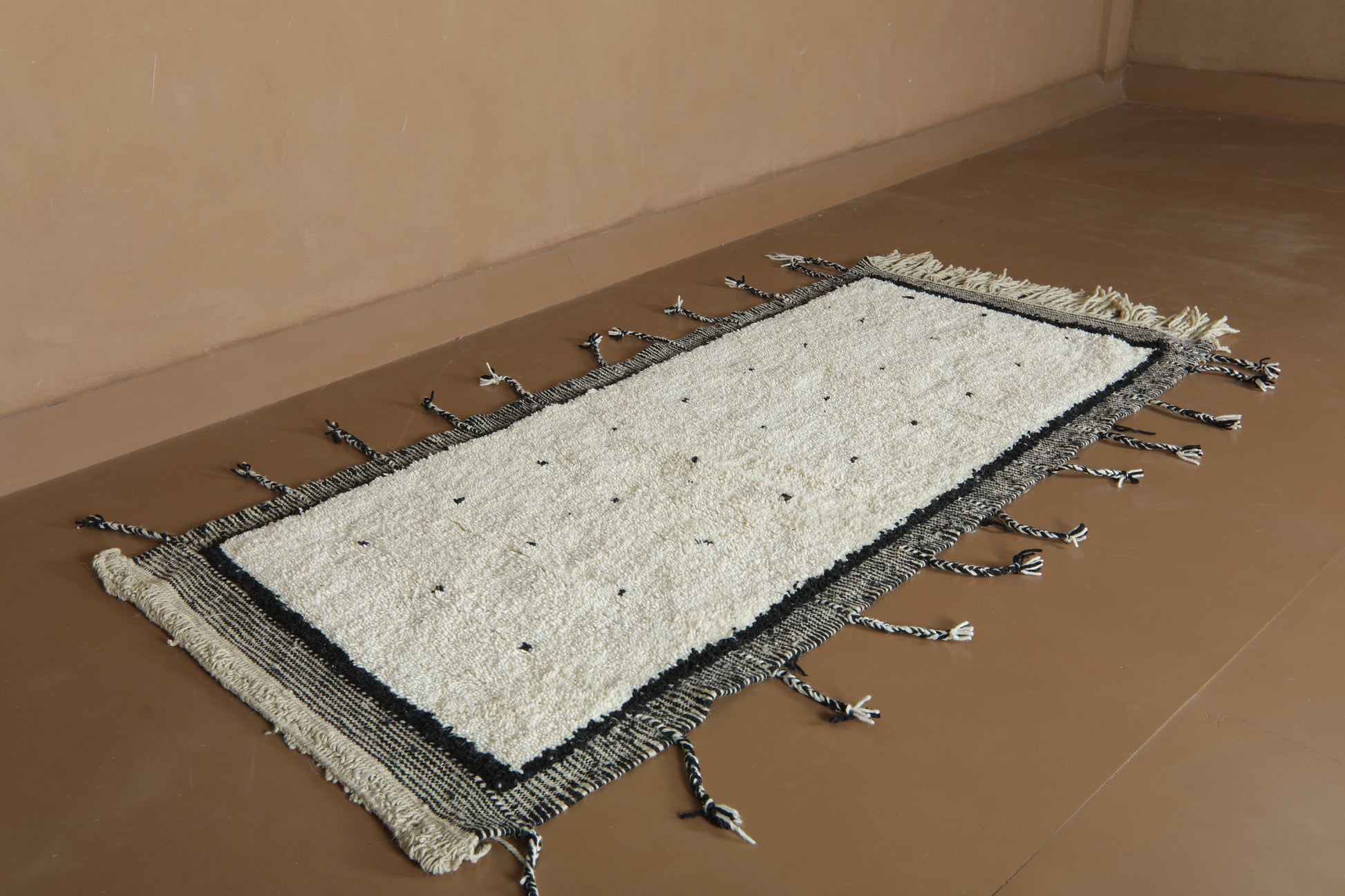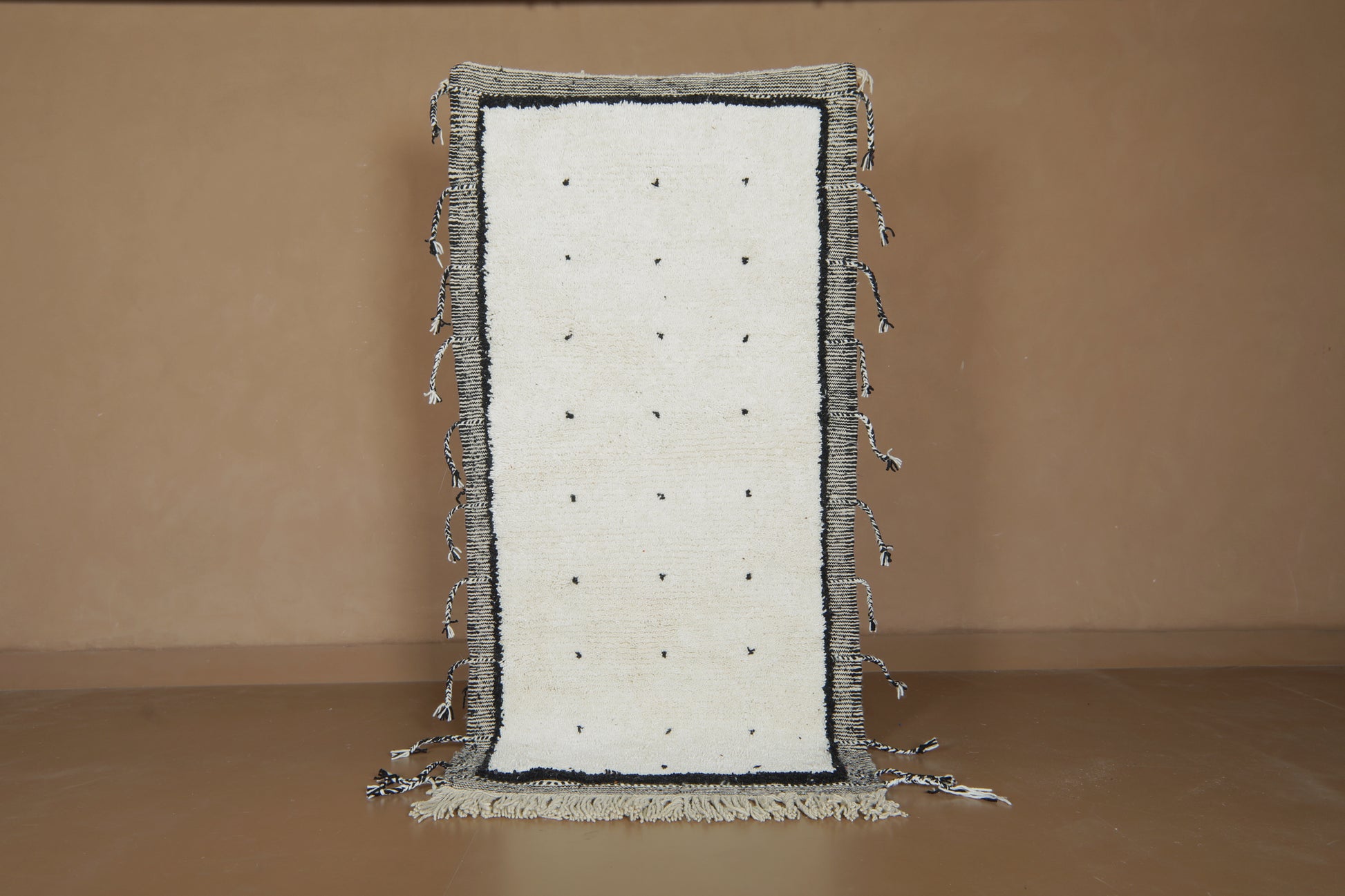 A celebration of Amazigh minimalism, the RUG is a refined statement of Moroccan craft. Its creamy ivory wool field is accented with small, hand-knotted black dots—each one a subtle emblem of tribal symbolism and the artisan’s hand. A bold black border, finished with intricate striped side tassels, frames the composition with graphic clarity.