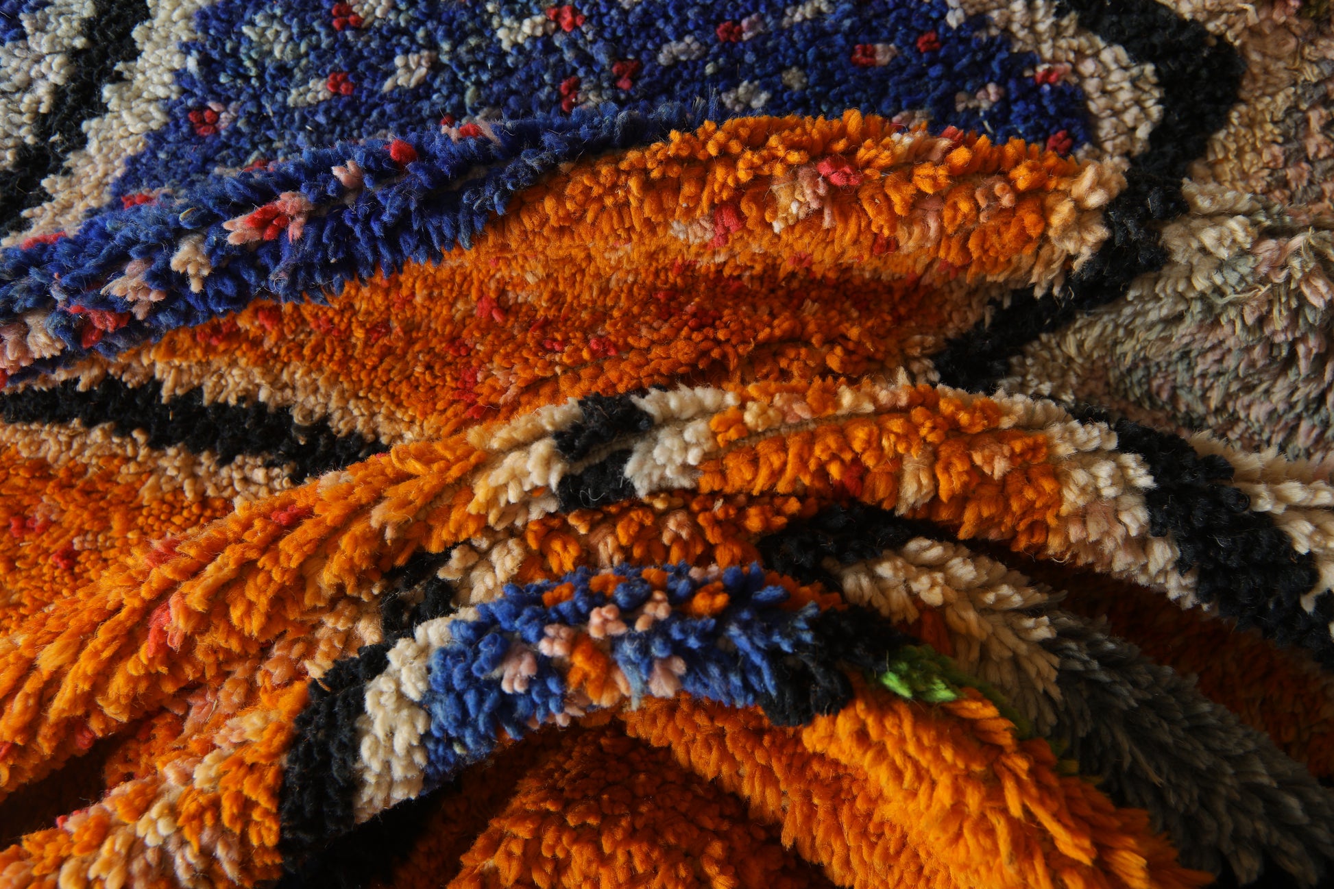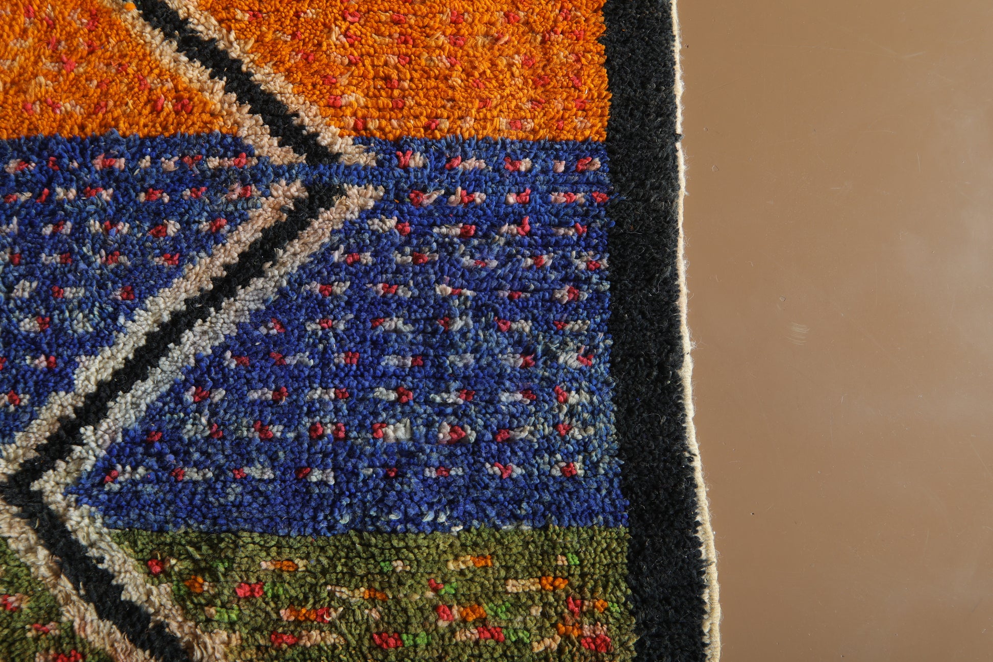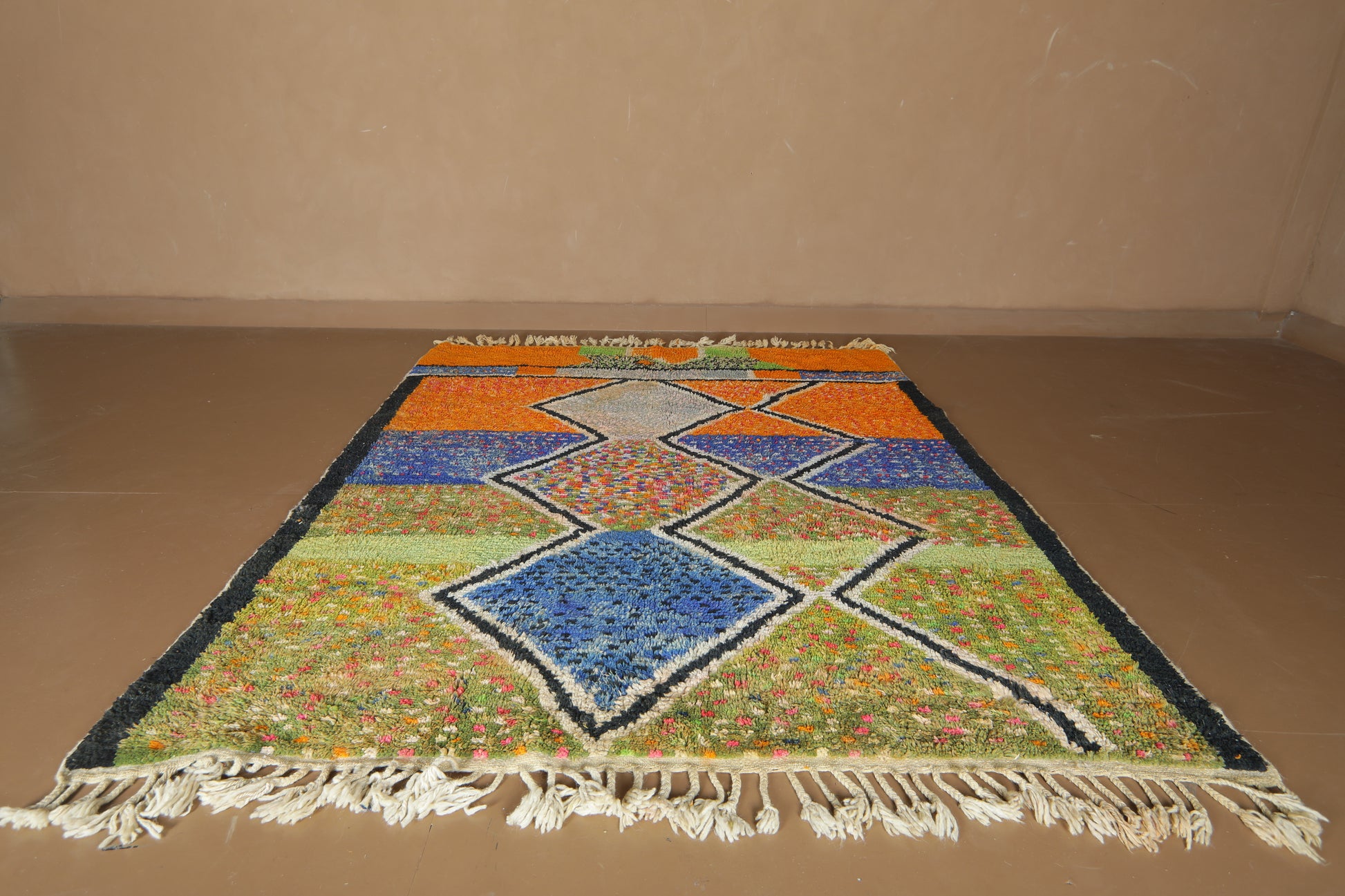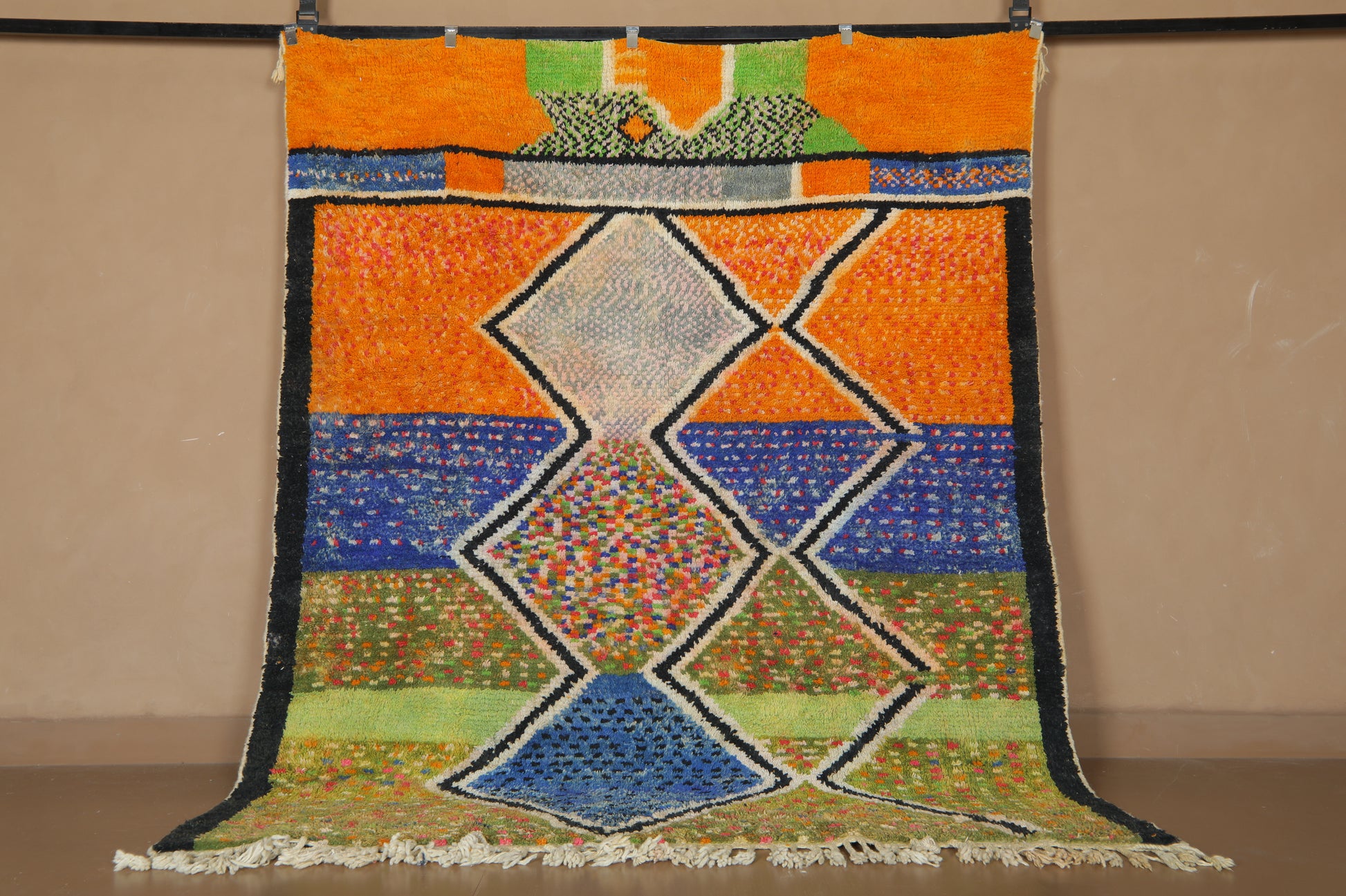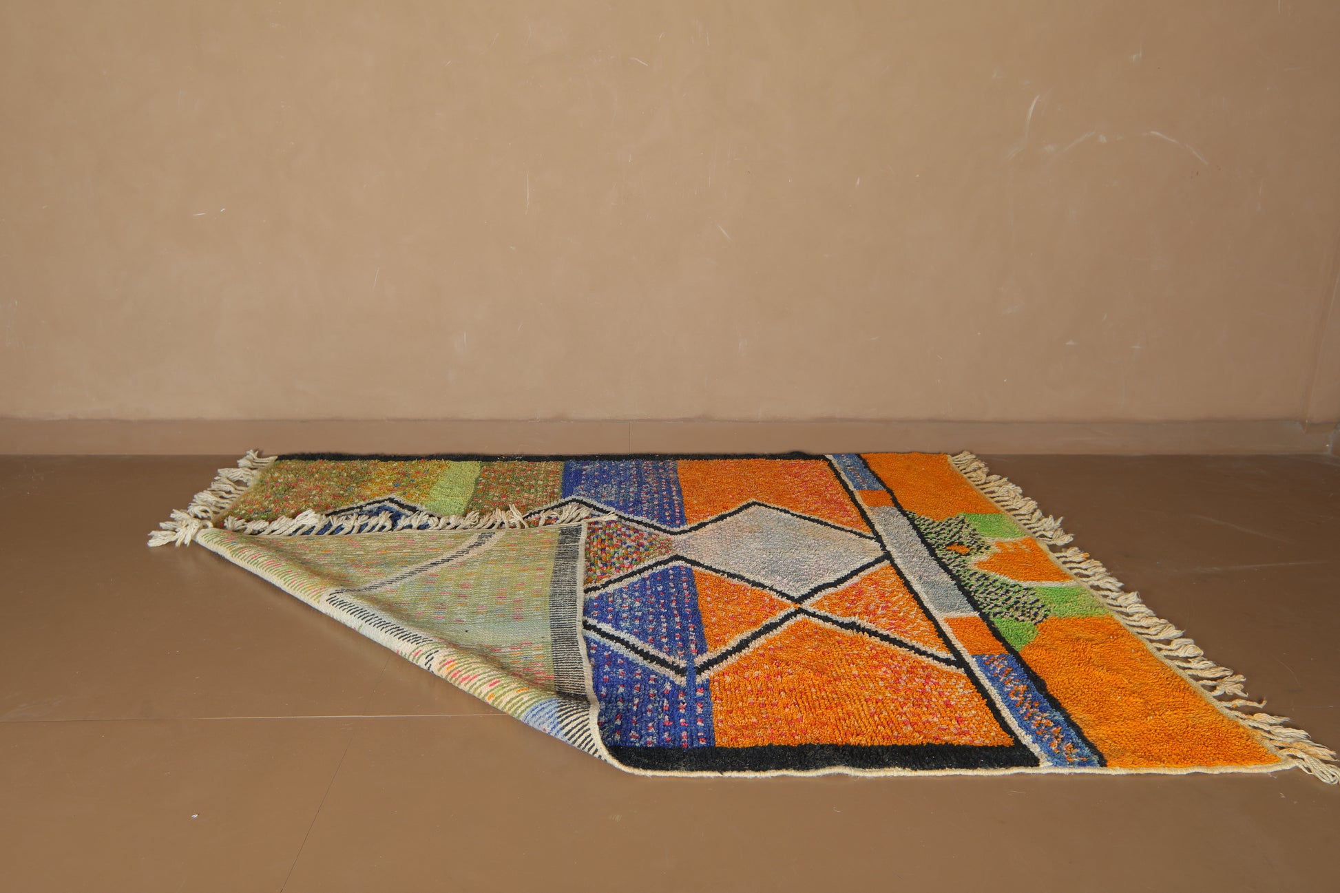 Bring bold artistry into your home with this handmade Moroccan Boujaad rug, featuring a lively mix of orange, blue, green, and multicolor patterns framed with striking black outlines. The geometric diamond motifs create a dynamic centerpiece, while the vibrant palette celebrates Moroccan tradition in a modern way.