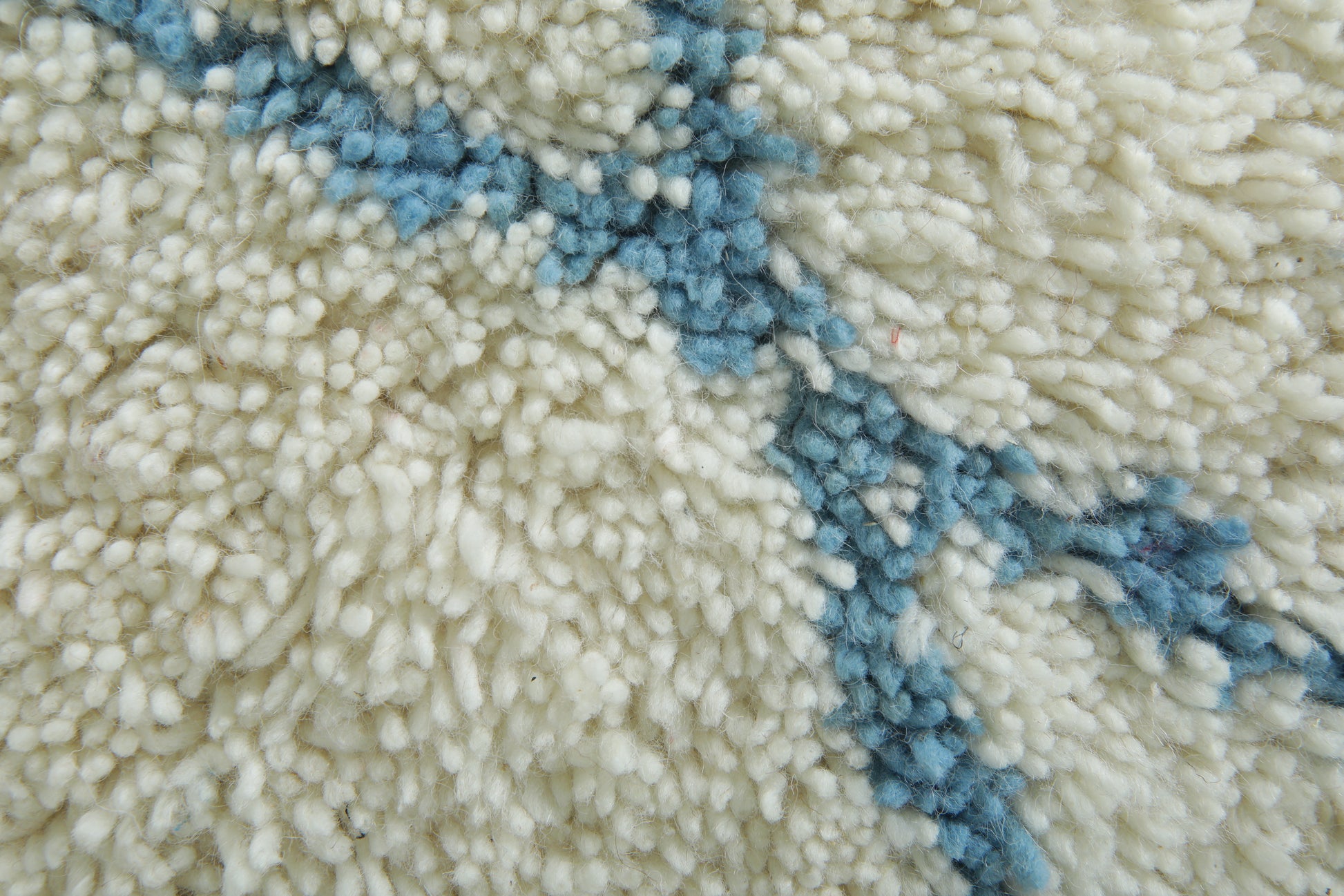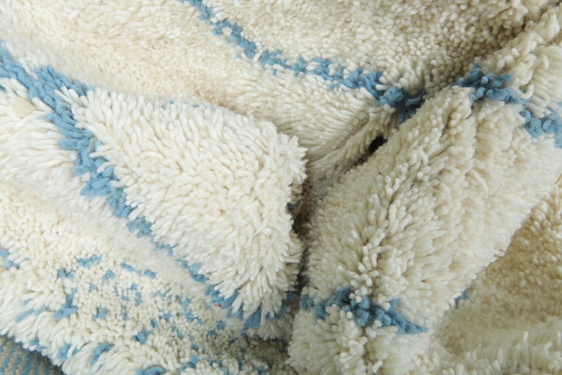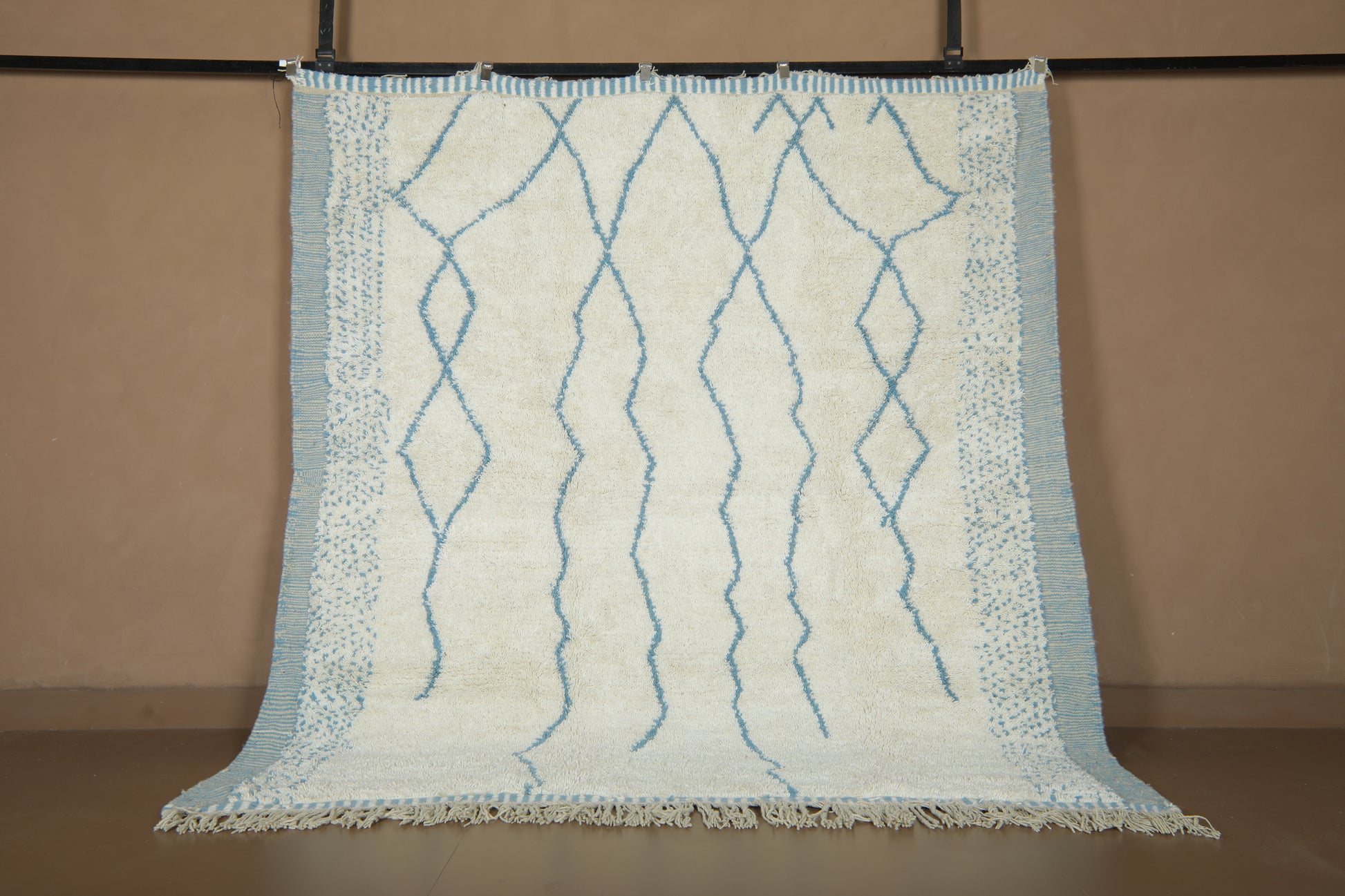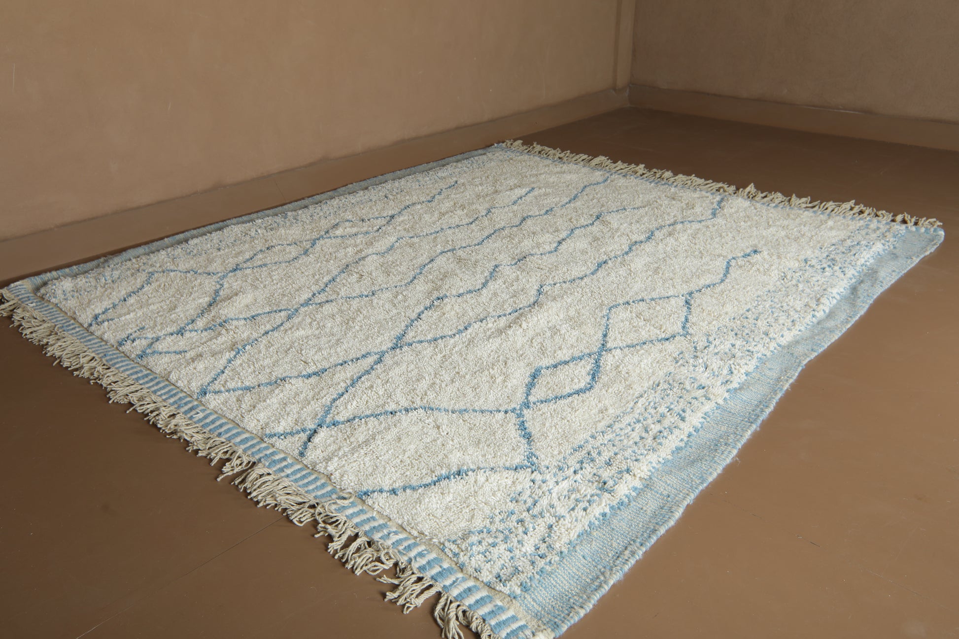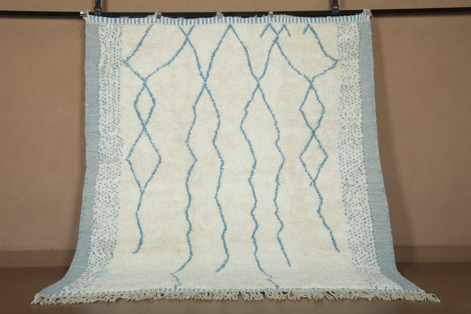 This beautiful handmade Moroccan wool rug blends tradition with a refreshing, modern twist. Woven in a soft ivory base and detailed with delicate sky blue linear patterns, it captures the calm and rhythm of natural movement — like ripples in water or mountain peaks on the horizon.