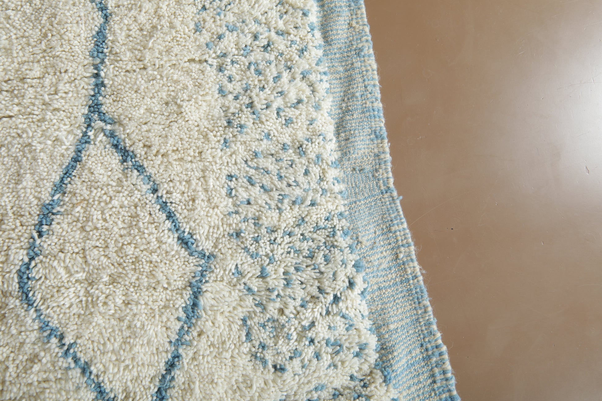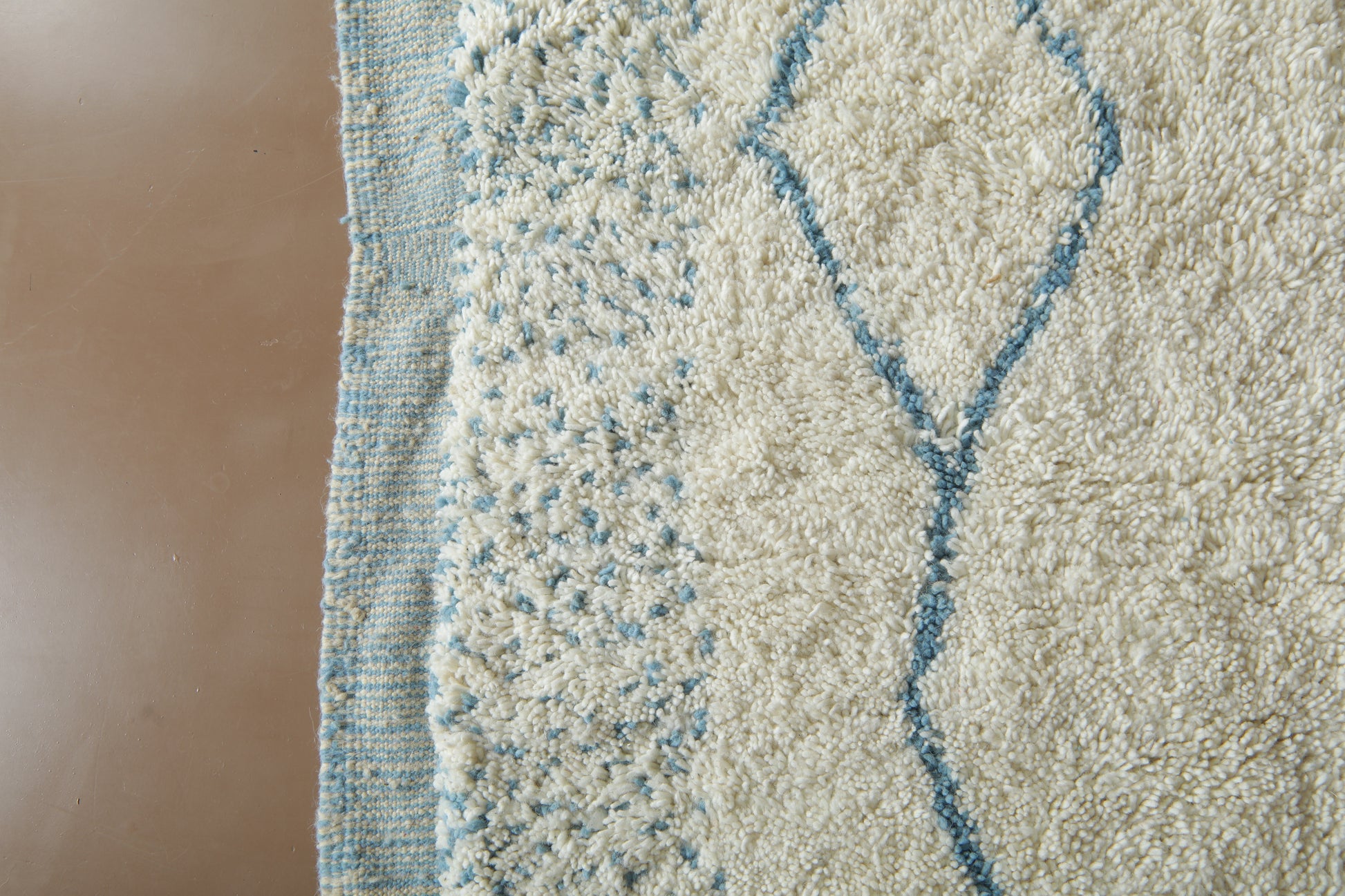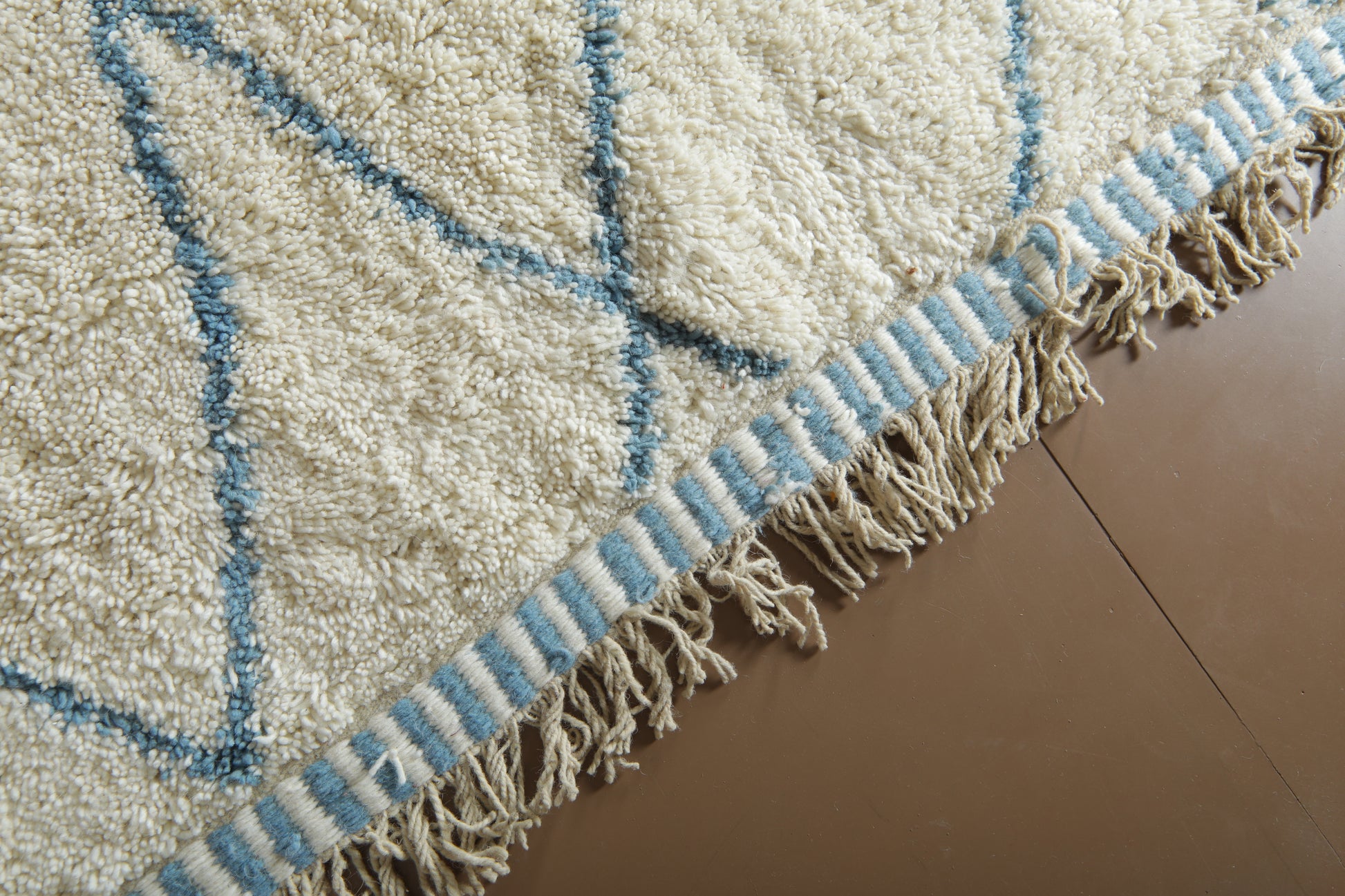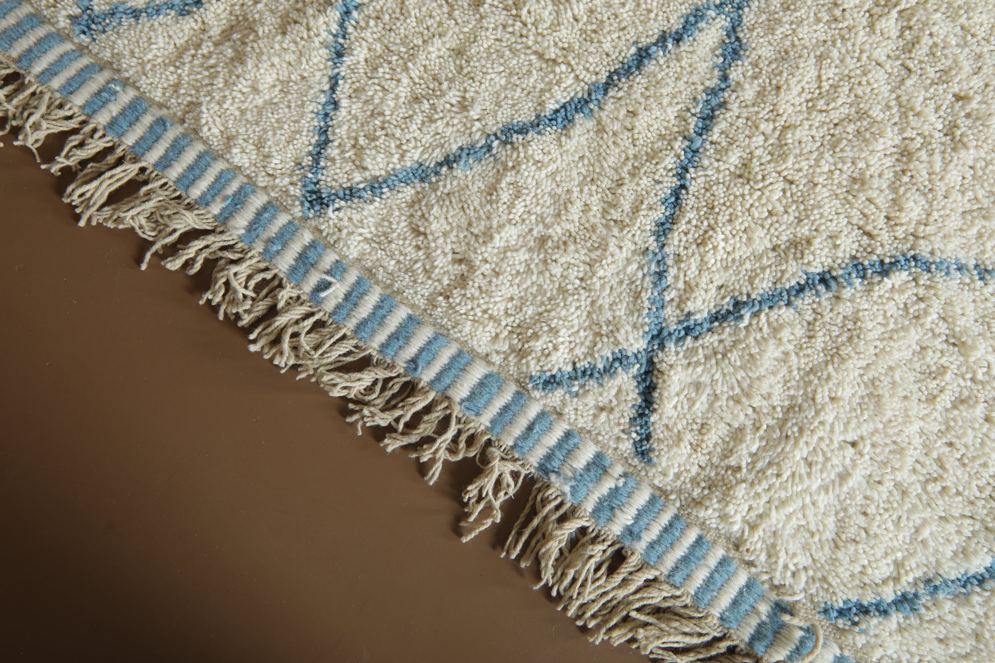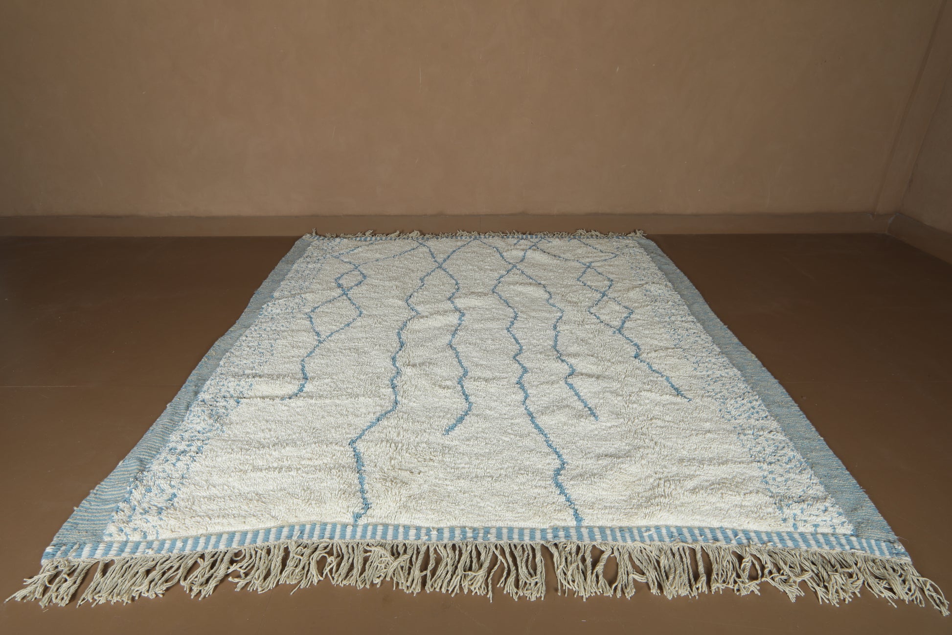 This beautiful handmade Moroccan wool rug blends tradition with a refreshing, modern twist. Woven in a soft ivory base and detailed with delicate sky blue linear patterns, it captures the calm and rhythm of natural movement — like ripples in water or mountain peaks on the horizon.