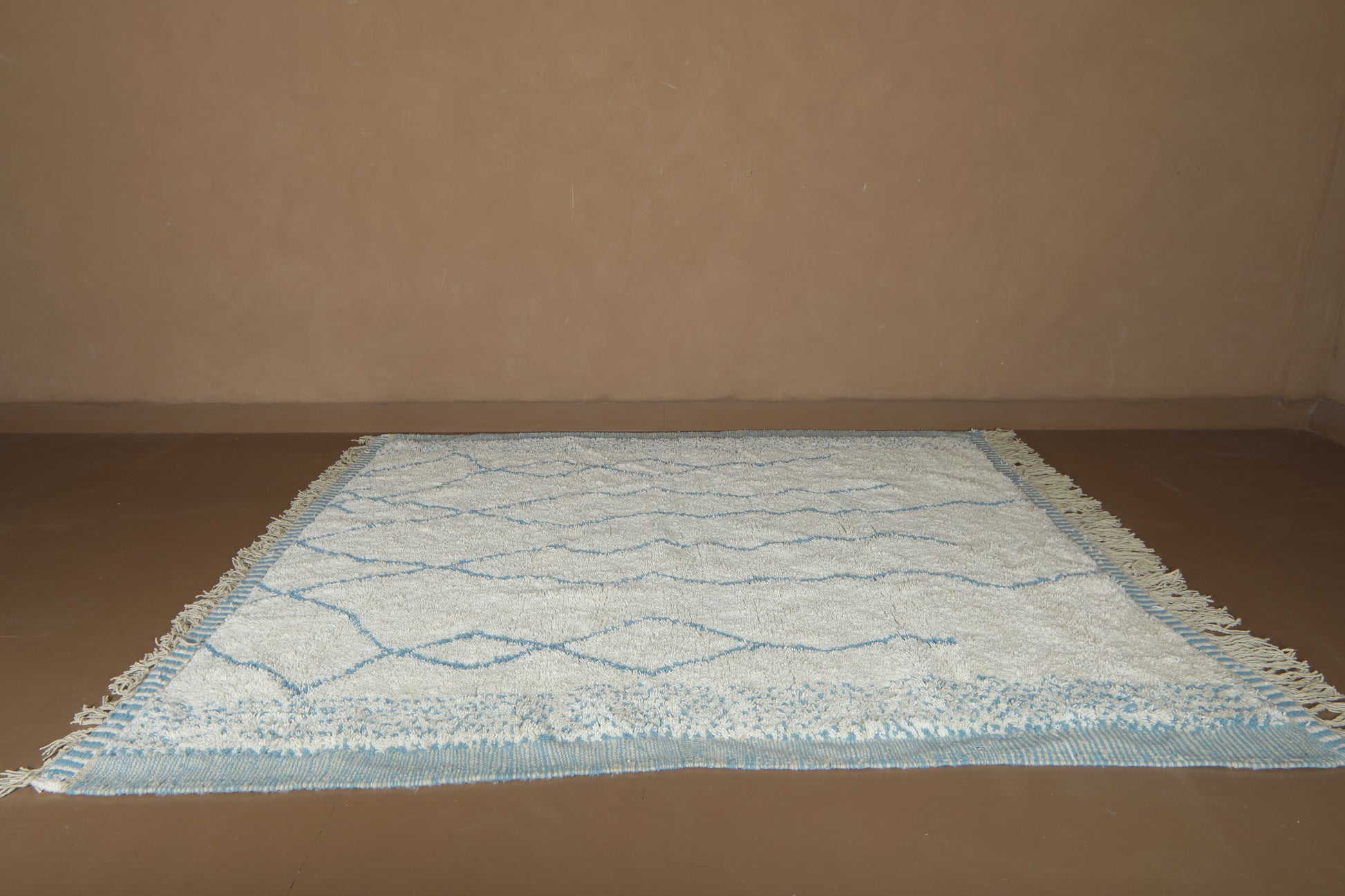 Its border, detailed with intricate woven textures and fringes, adds depth and artisan character while maintaining a clean, minimalist look. Crafted with 100% natural wool, the rug offers both visual softness and plush comfort underfoot.