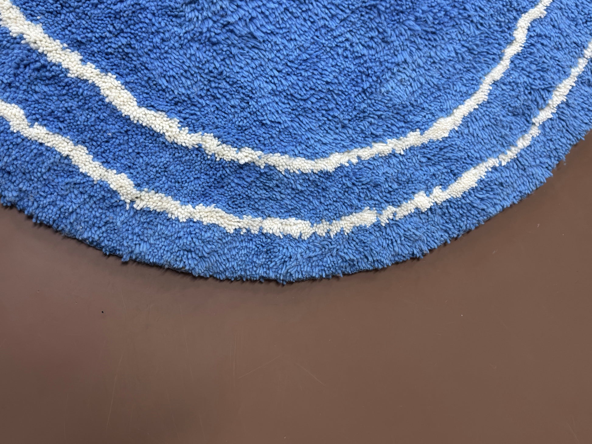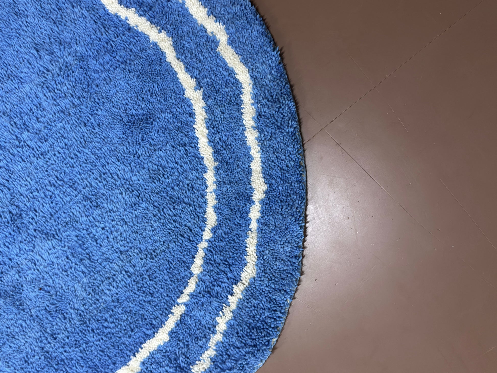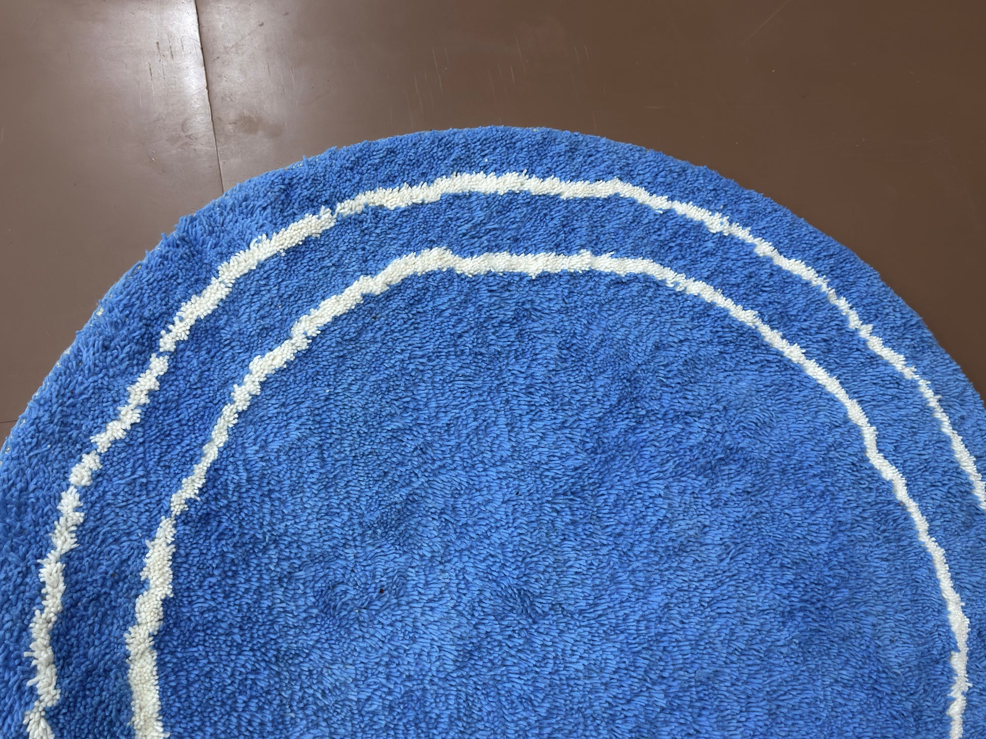 Bring a pop of color and artisanal charm into your space with this handmade Moroccan round rug. Featuring a bold blue base accented by soft ivory ripple lines, it's a modern take on traditional Berber craftsmanship.