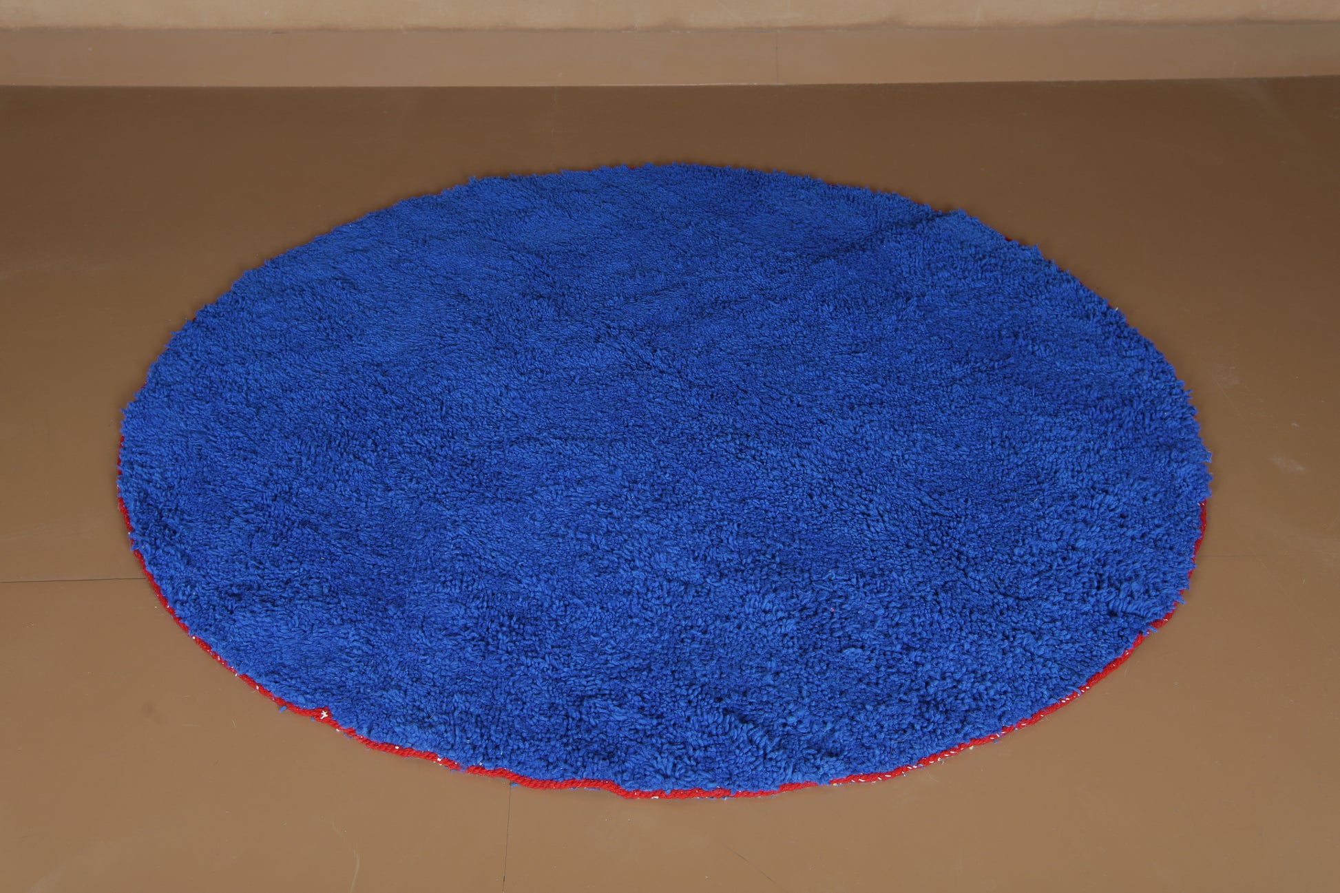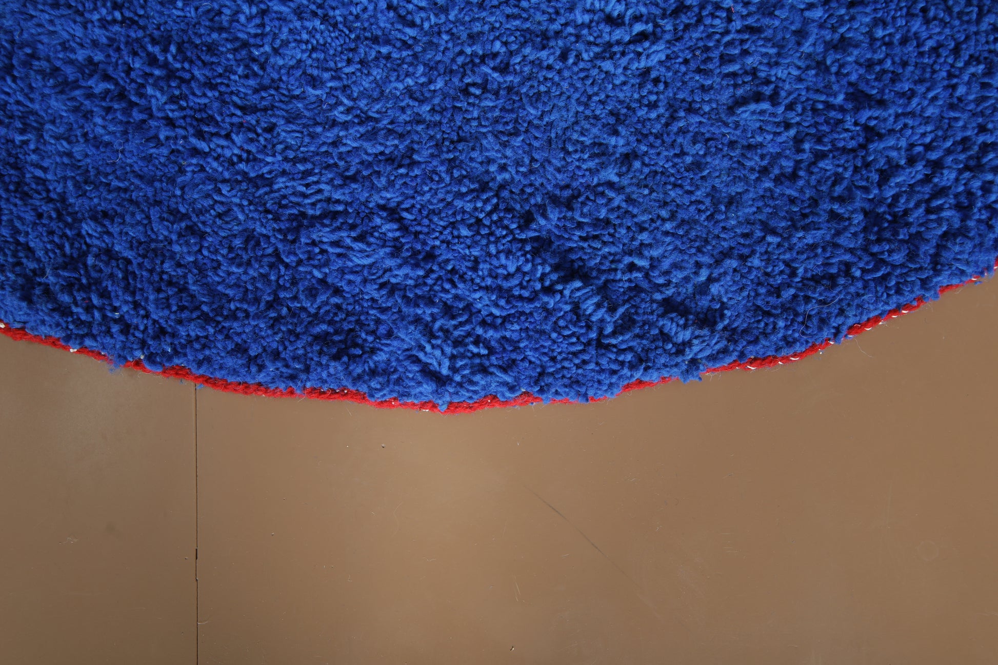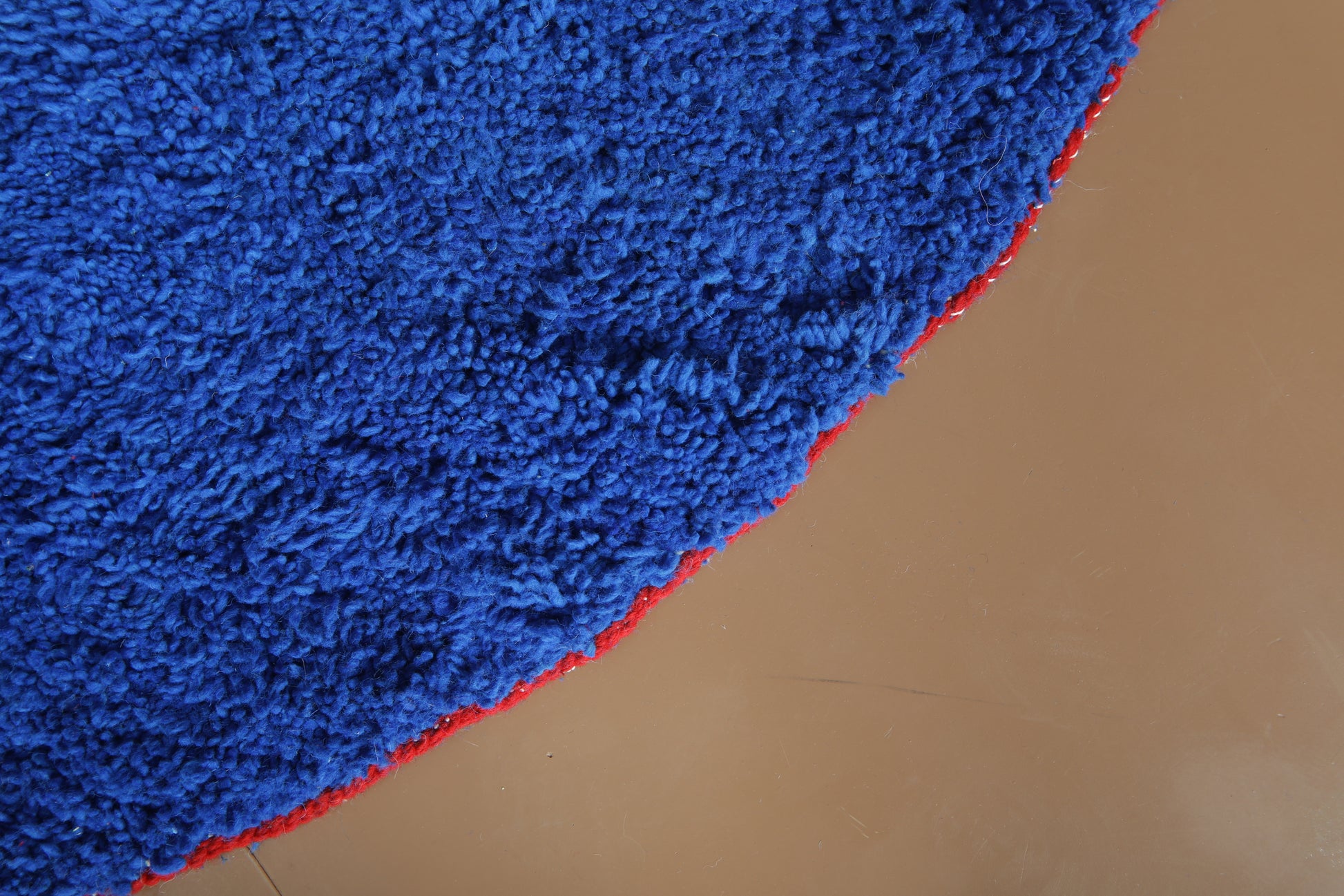 Infuse bold color and artisanal charm into your space with this custom round Moroccan wool rug, handwoven with care and creativity. Featuring a vibrant royal blue pile with a subtle red border peeking from underneath, this eye-catching rug offers both comfort and personality in equal measure.