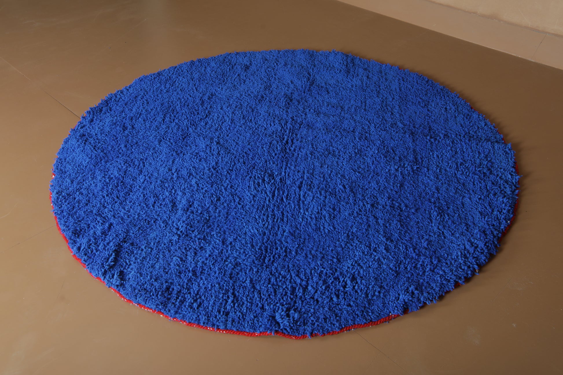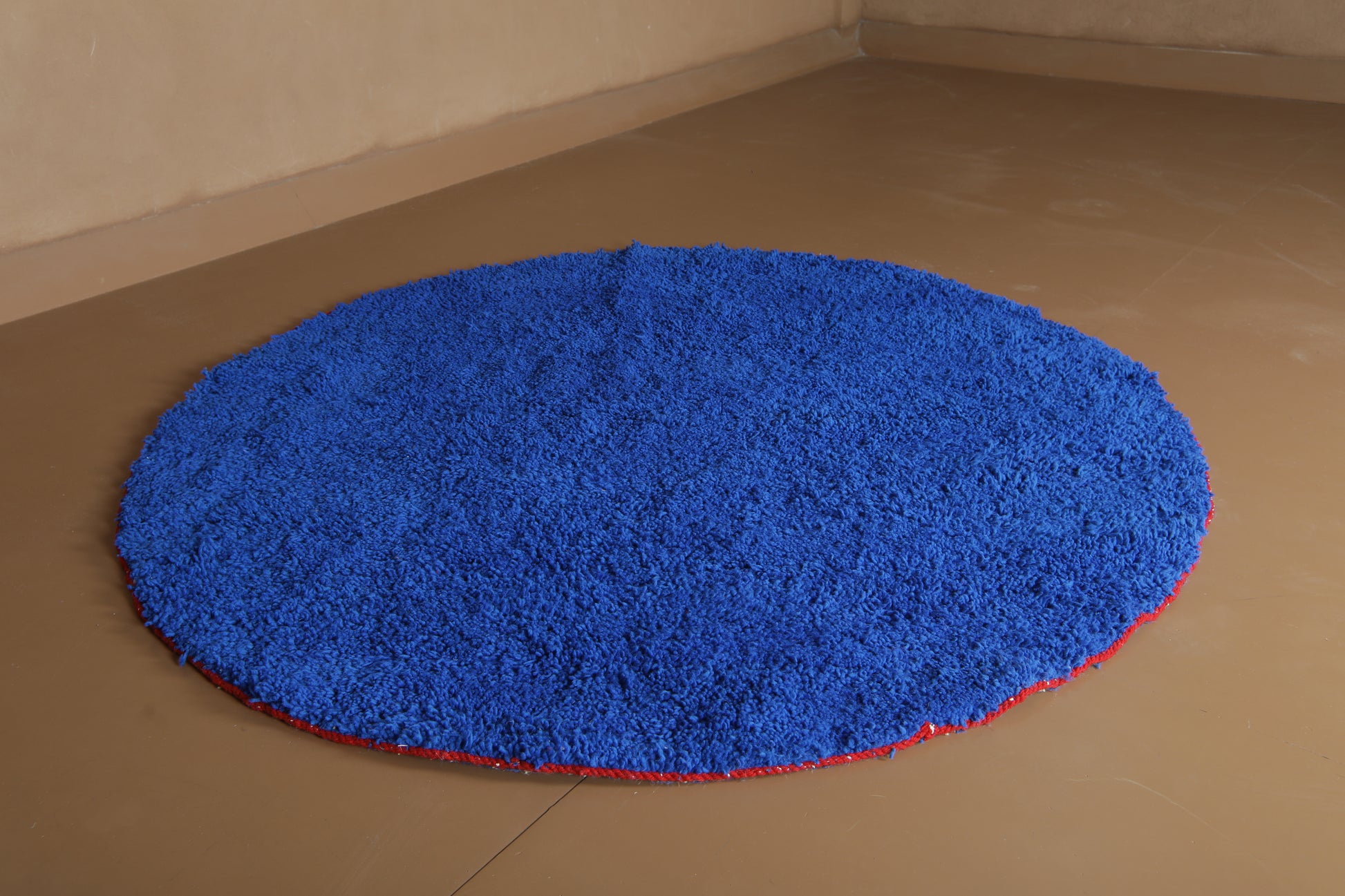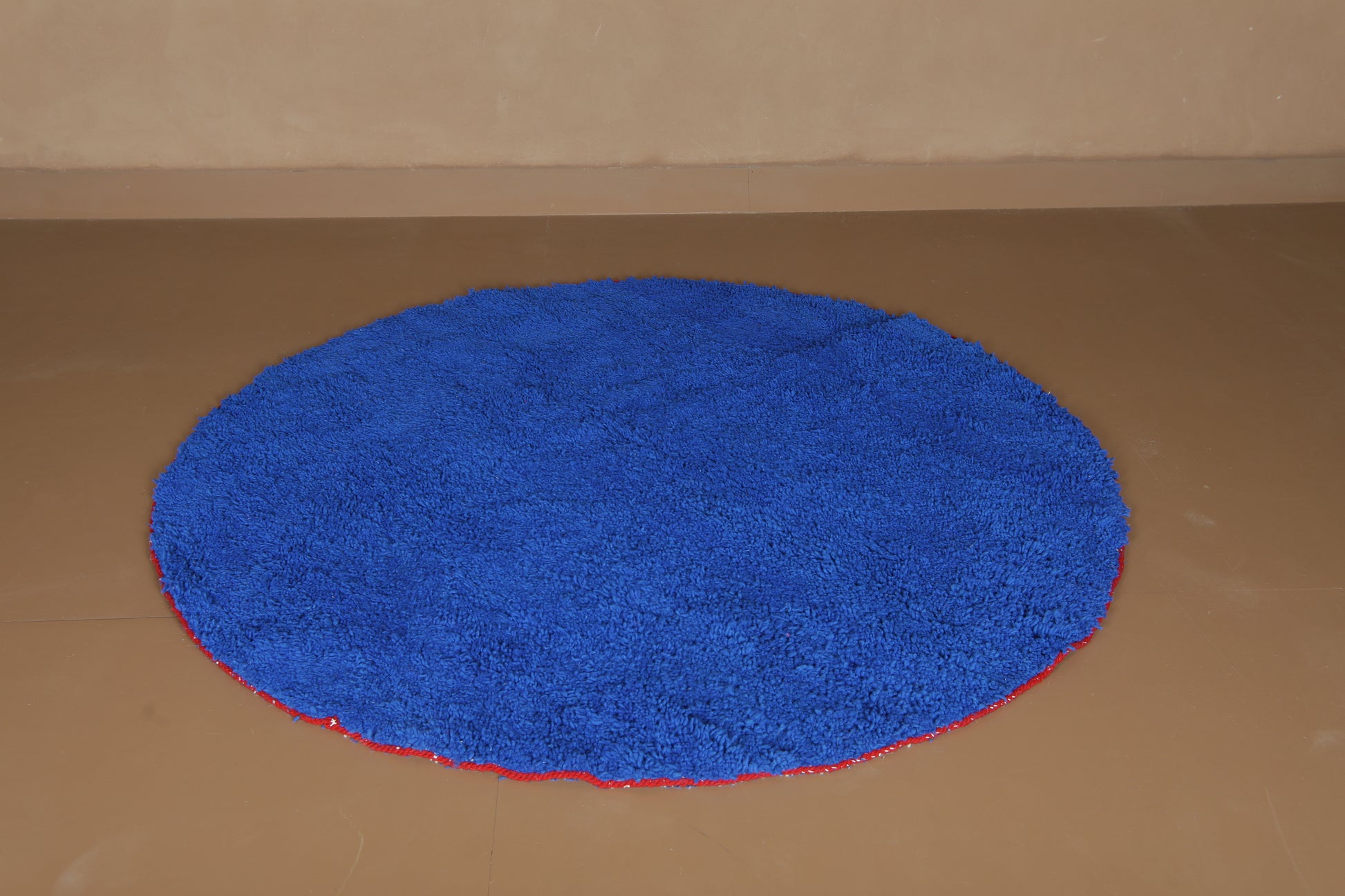 Infuse bold color and artisanal charm into your space with this custom round Moroccan wool rug, handwoven with care and creativity. Featuring a vibrant royal blue pile with a subtle red border peeking from underneath, this eye-catching rug offers both comfort and personality in equal measure.