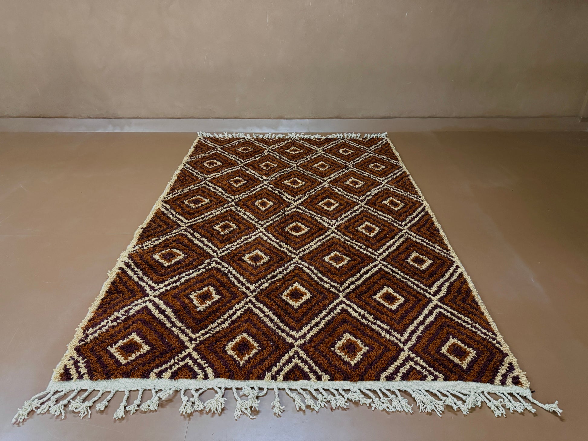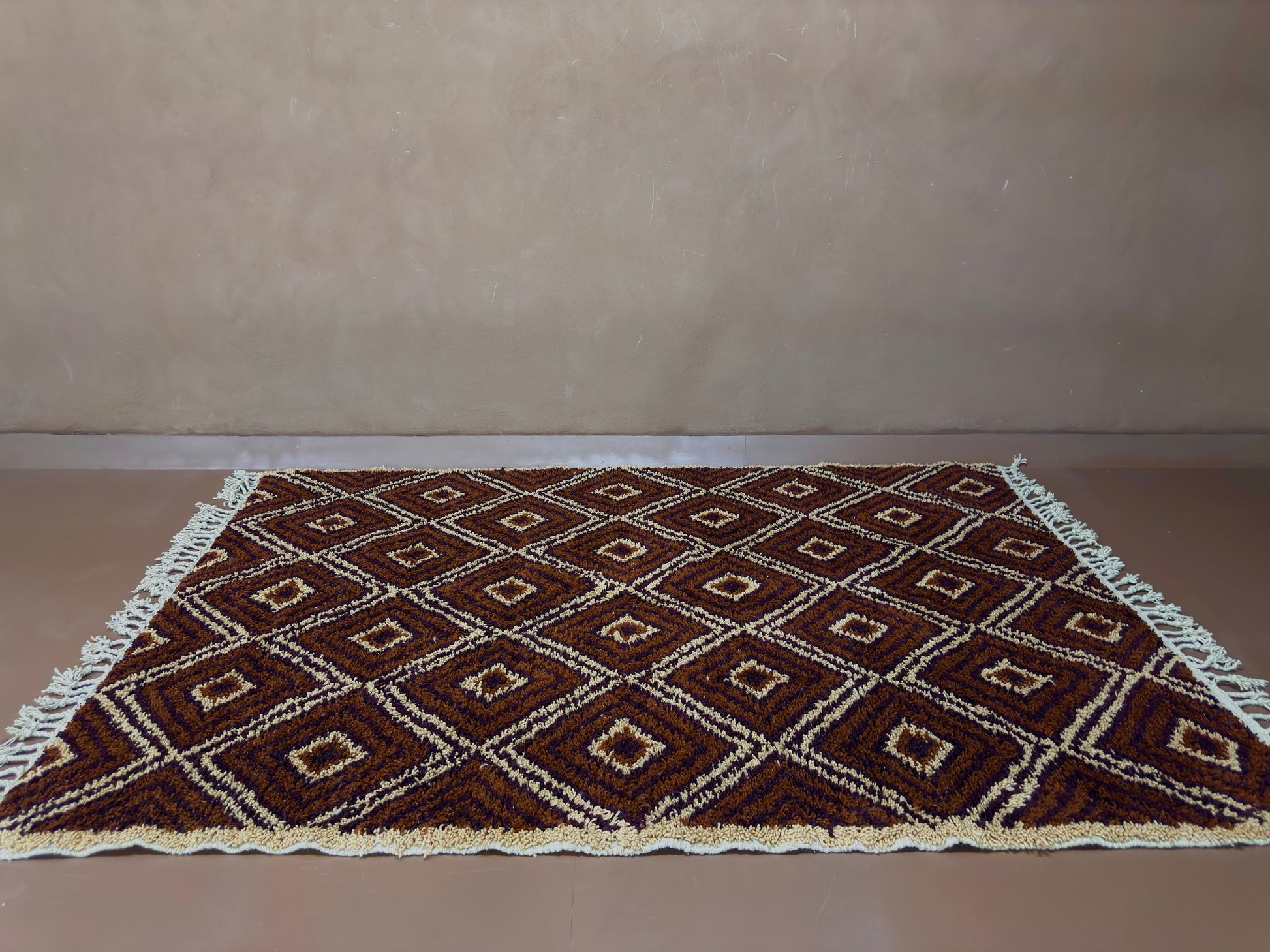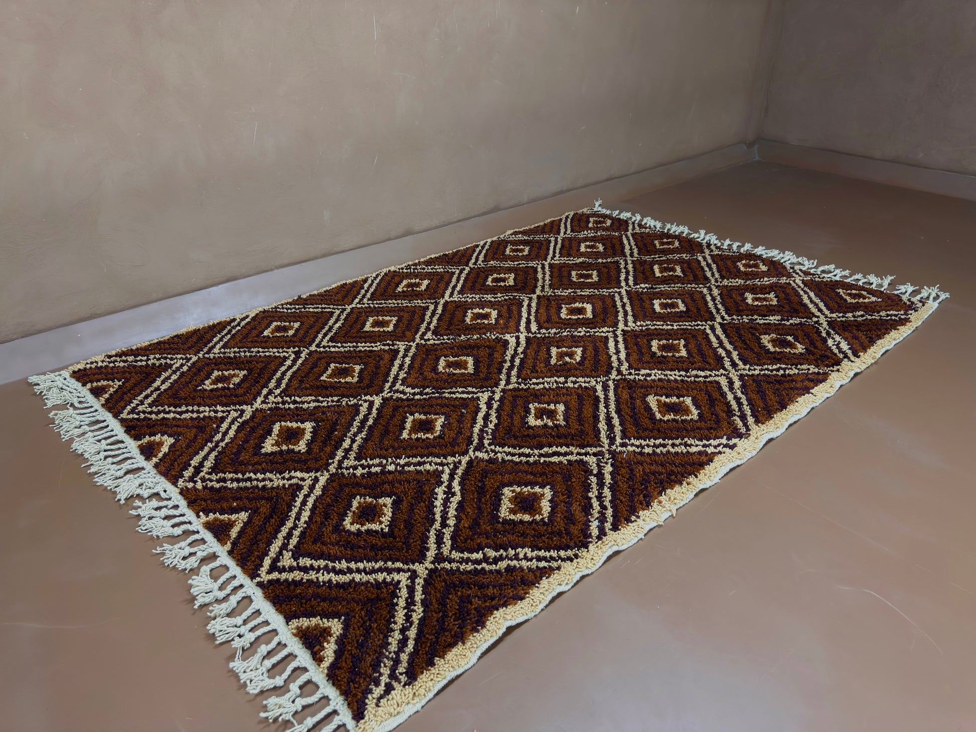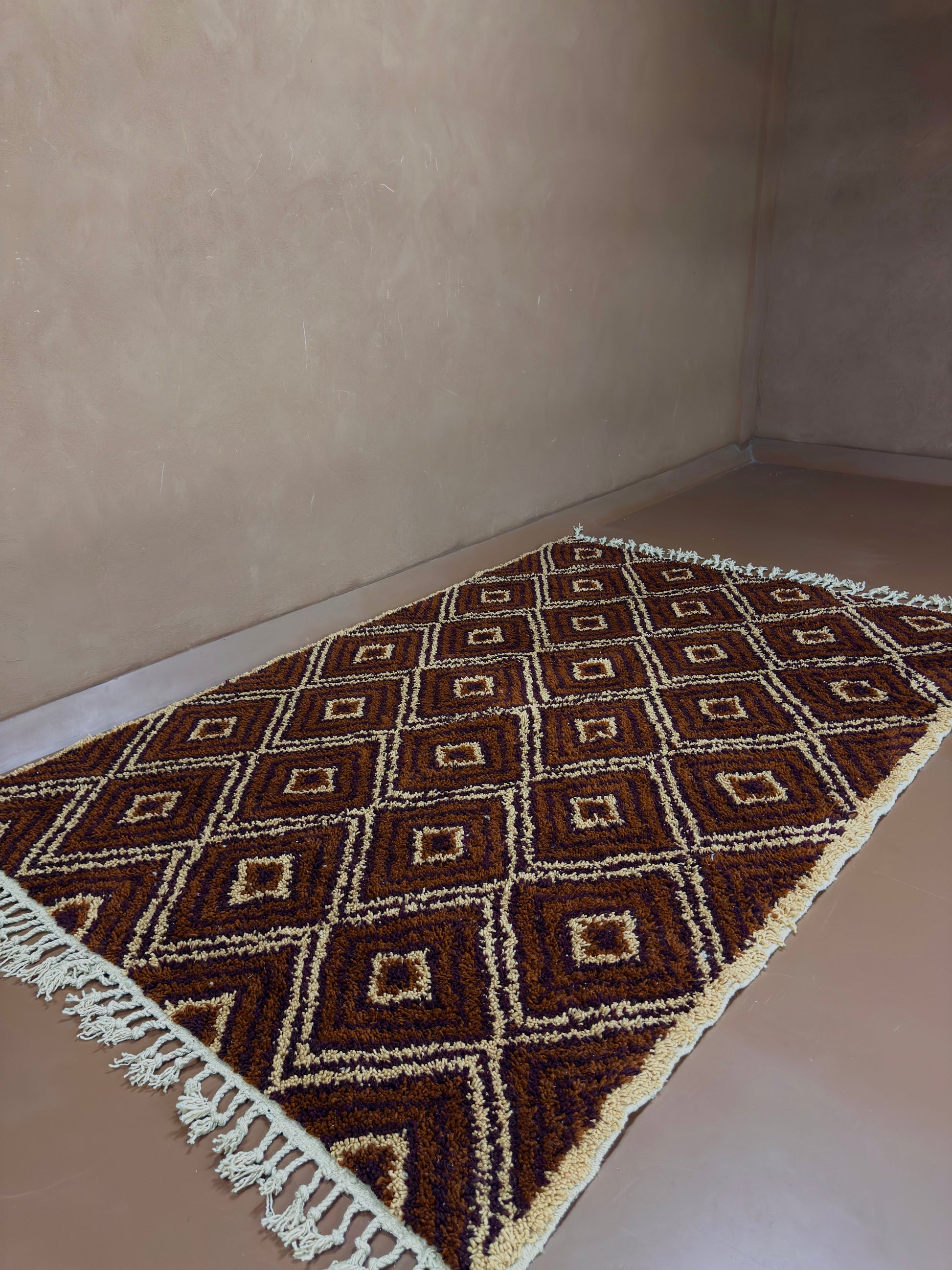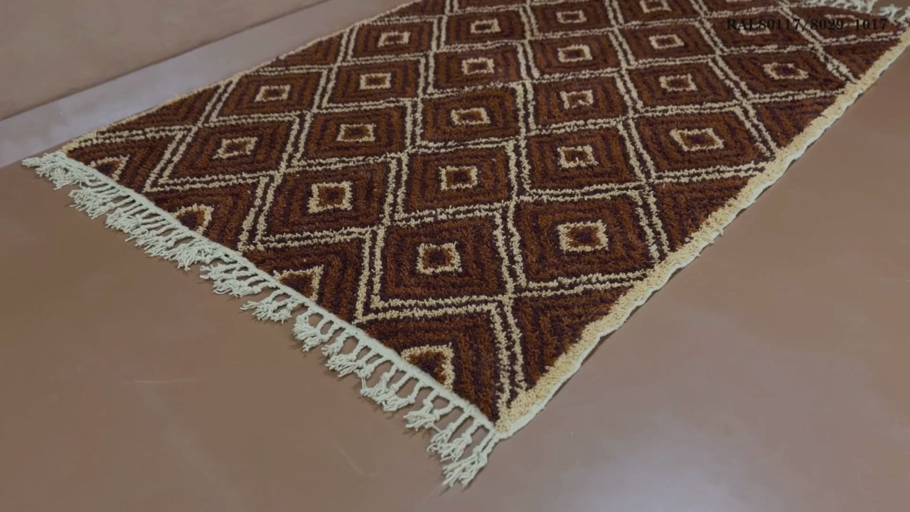 Bring the soul of Moroccan artistry into your space with this custom handwoven Berber rug, crafted in a timeless diamond motif. Featuring a bold interplay of chocolate brown, copper, and saffron yellow tones, this rug reflects deep-rooted Berber symbolism and the natural colors of the Atlas landscape.
