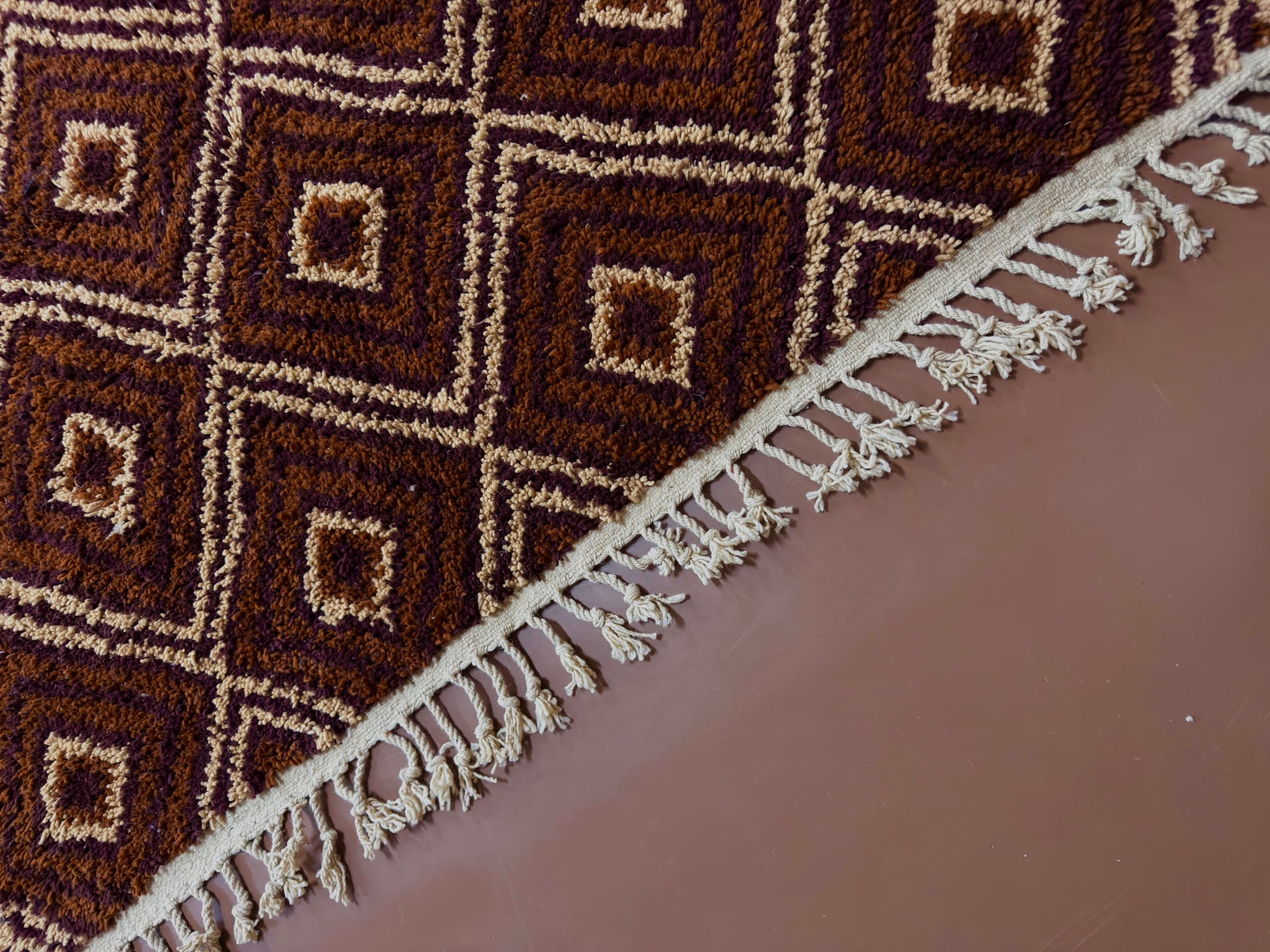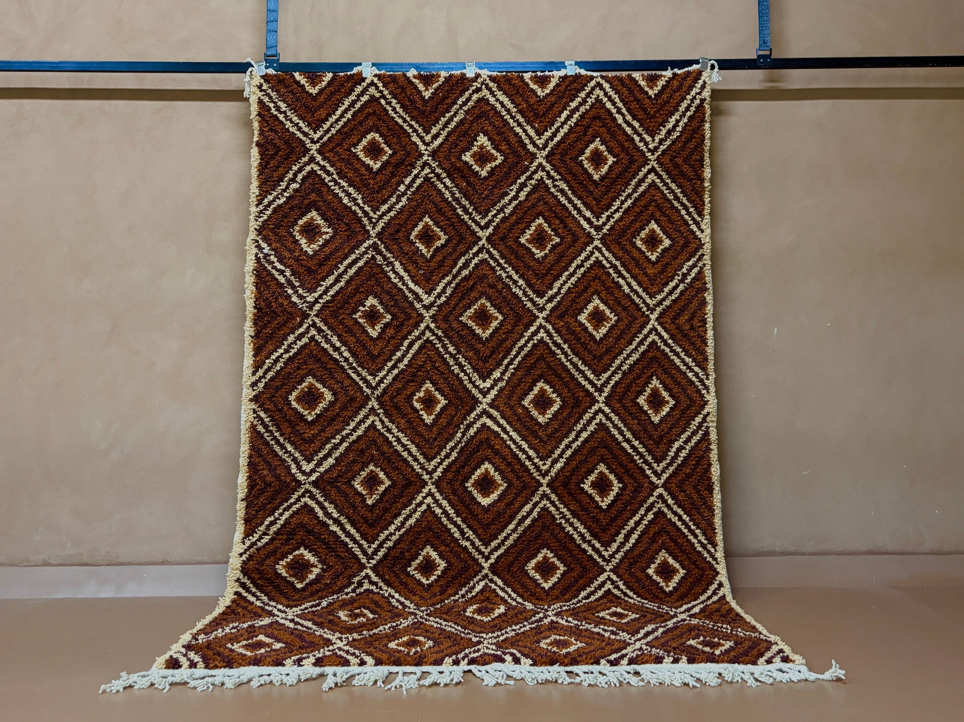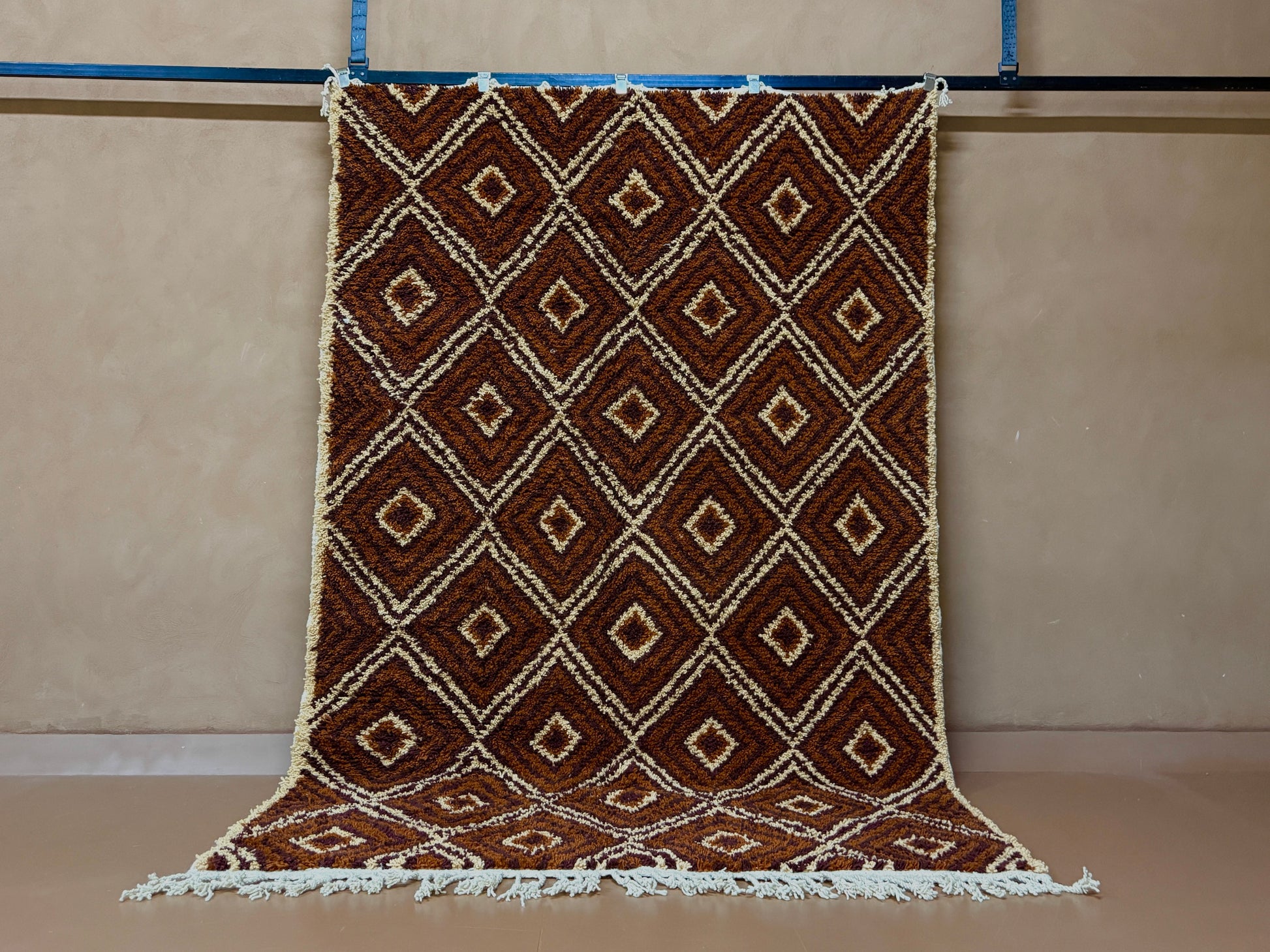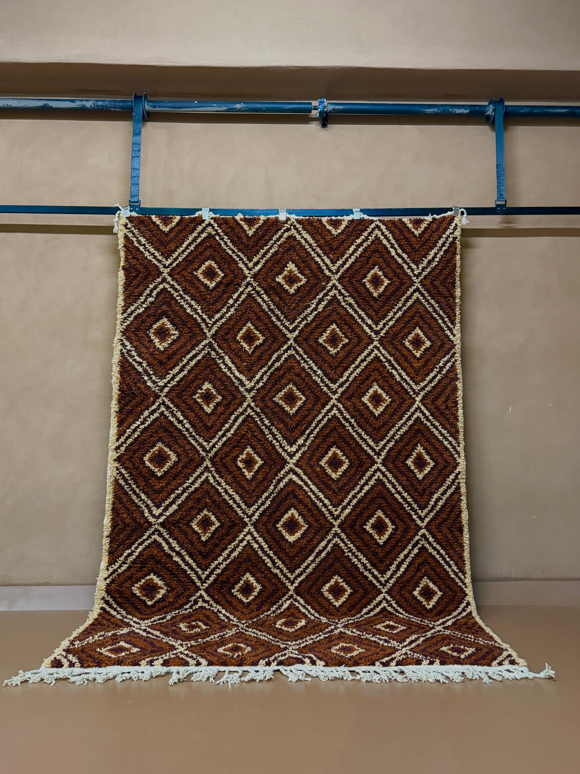 Bring the soul of Moroccan artistry into your space with this custom handwoven Berber rug, crafted in a timeless diamond motif. Featuring a bold interplay of chocolate brown, copper, and saffron yellow tones, this rug reflects deep-rooted Berber symbolism and the natural colors of the Atlas landscape.