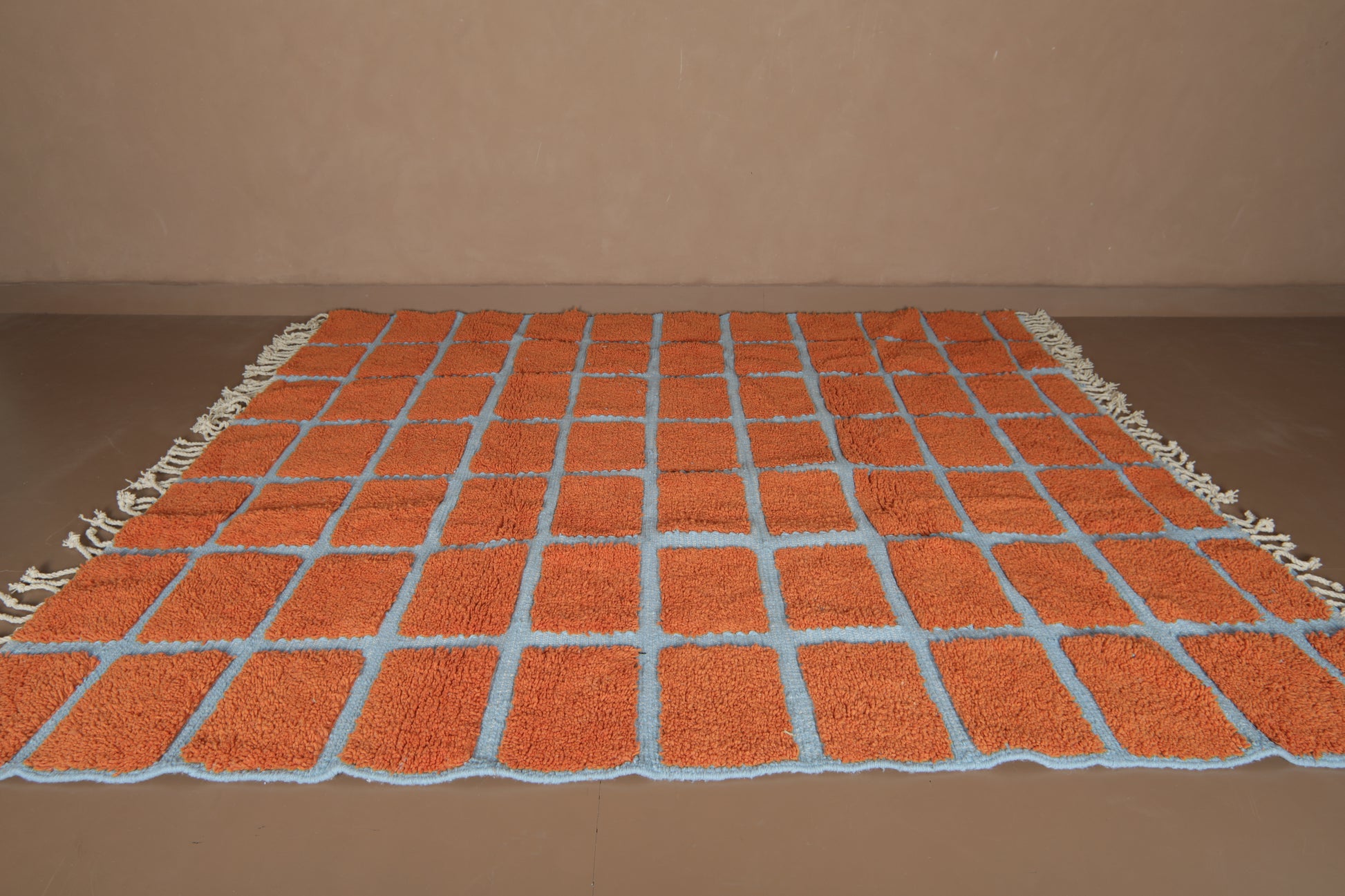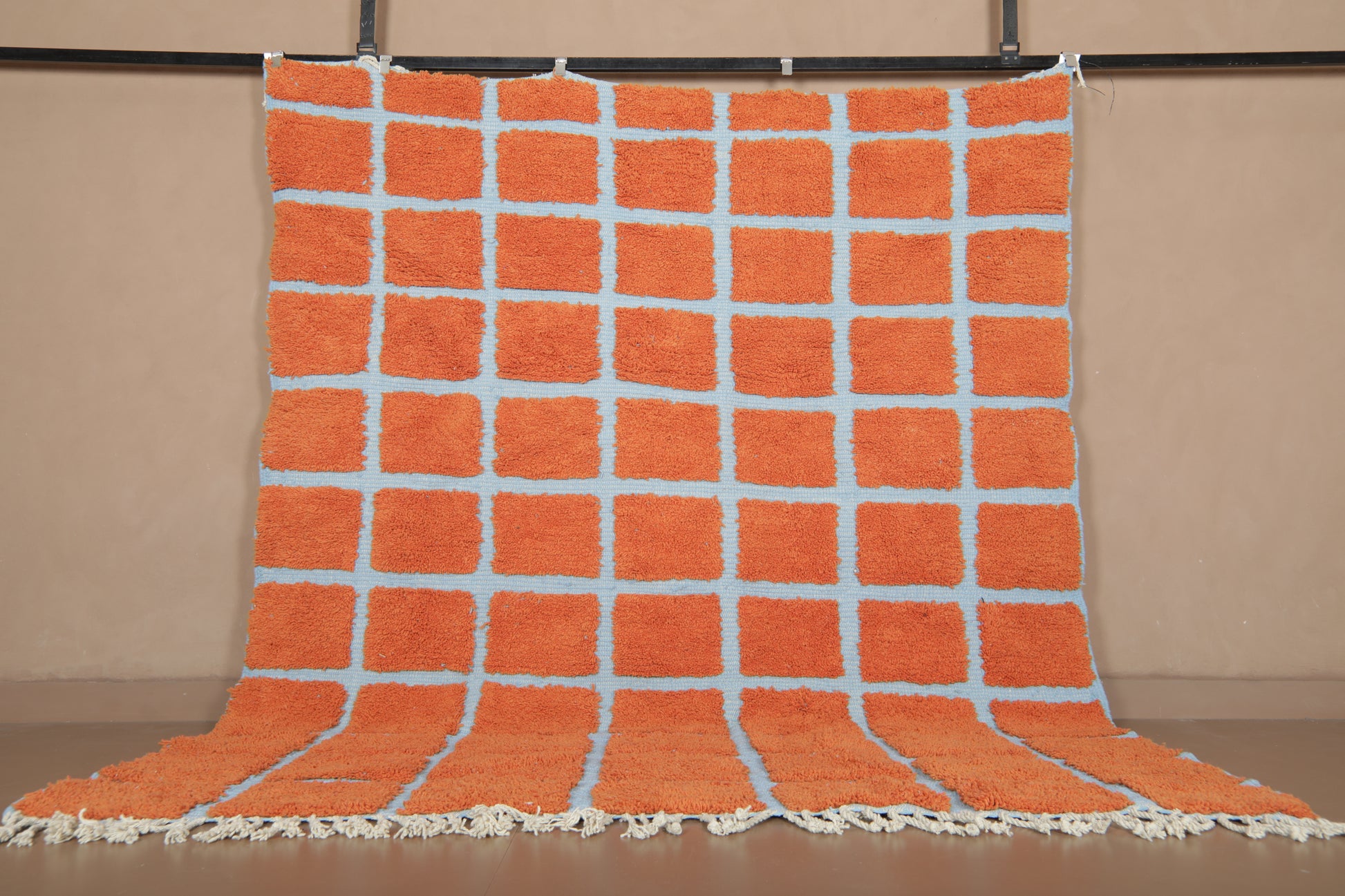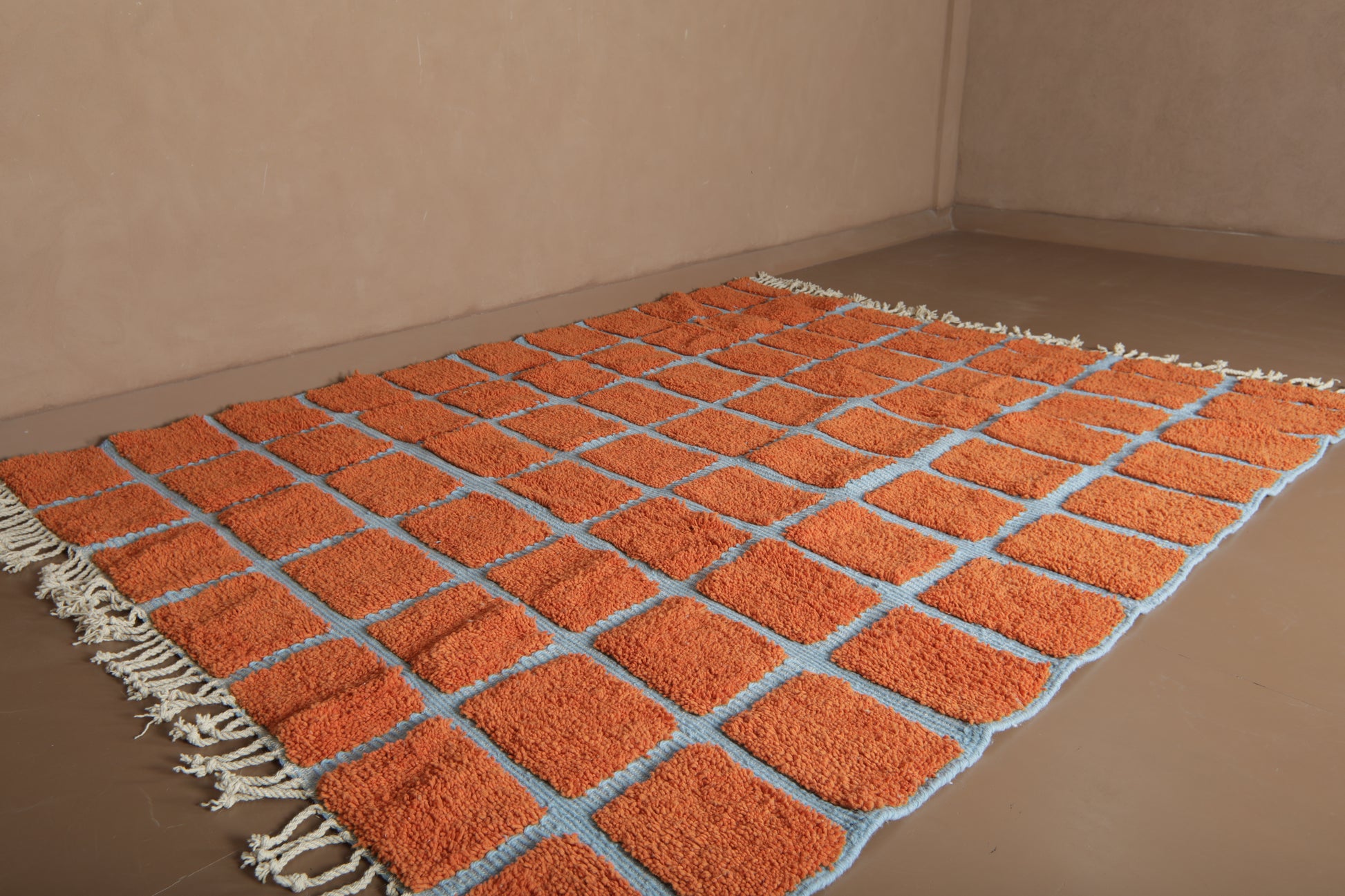 Elevate your space with the vibrant contrast of tradition and geometry. This handmade Moroccan wool rug features a striking checkered pattern in burnt orange (RAL2001) over a cool, powdery blue base (RAL5024). A fusion of bold design and timeless craftsmanship, this piece brings life and rhythm to both contemporary and boho-chic interiors.