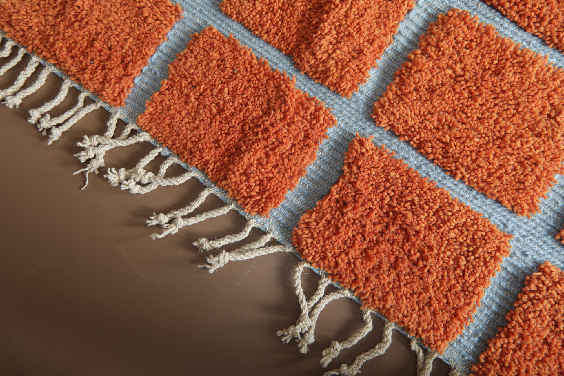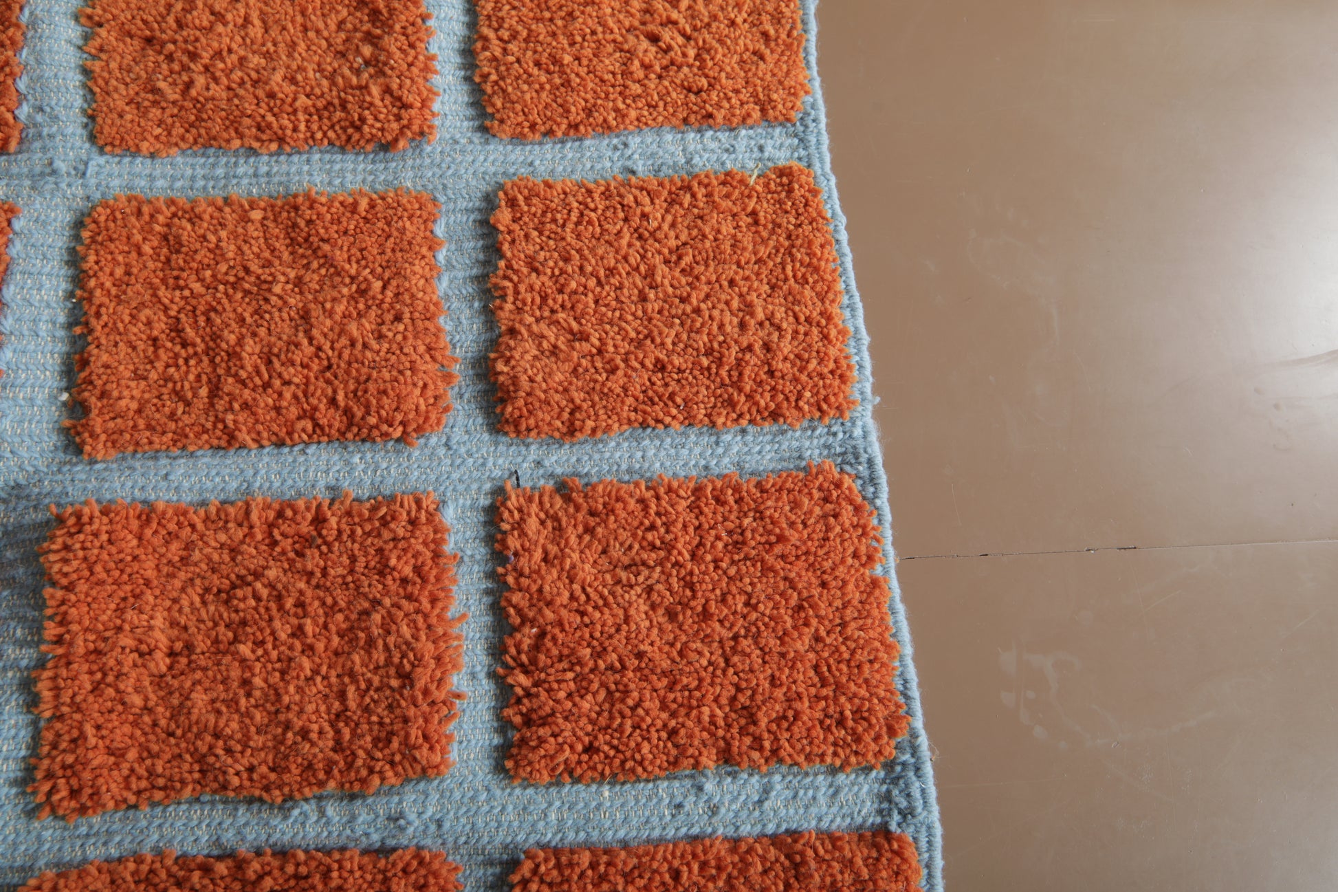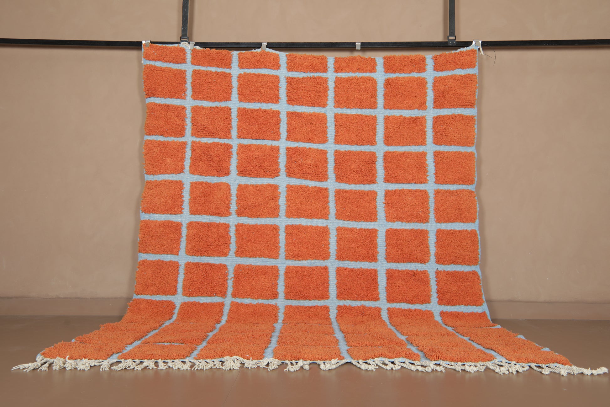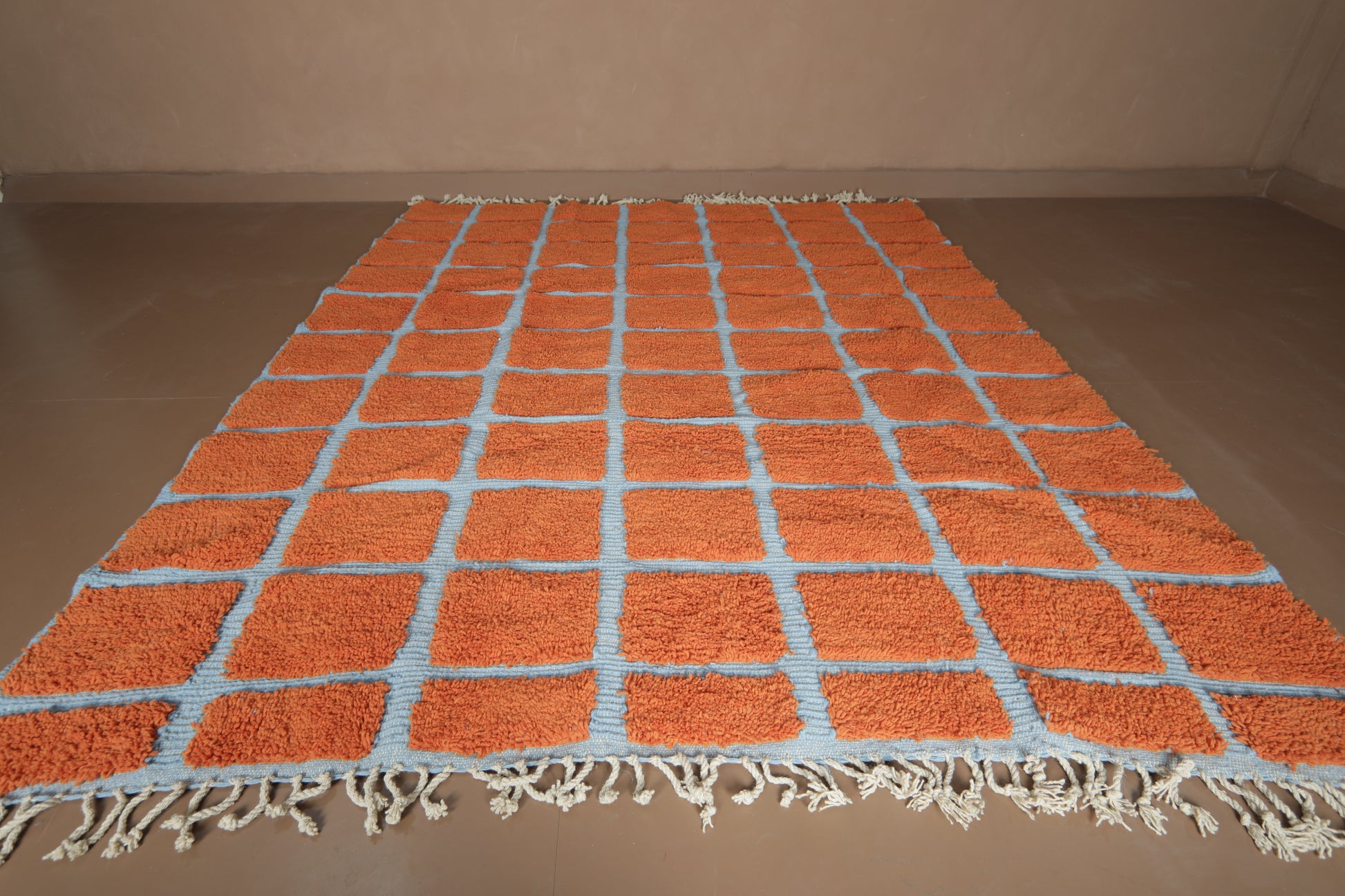 Elevate your space with the vibrant contrast of tradition and geometry. This handmade Moroccan wool rug features a striking checkered pattern in burnt orange (RAL2001) over a cool, powdery blue base (RAL5024). A fusion of bold design and timeless craftsmanship, this piece brings life and rhythm to both contemporary and boho-chic interiors.