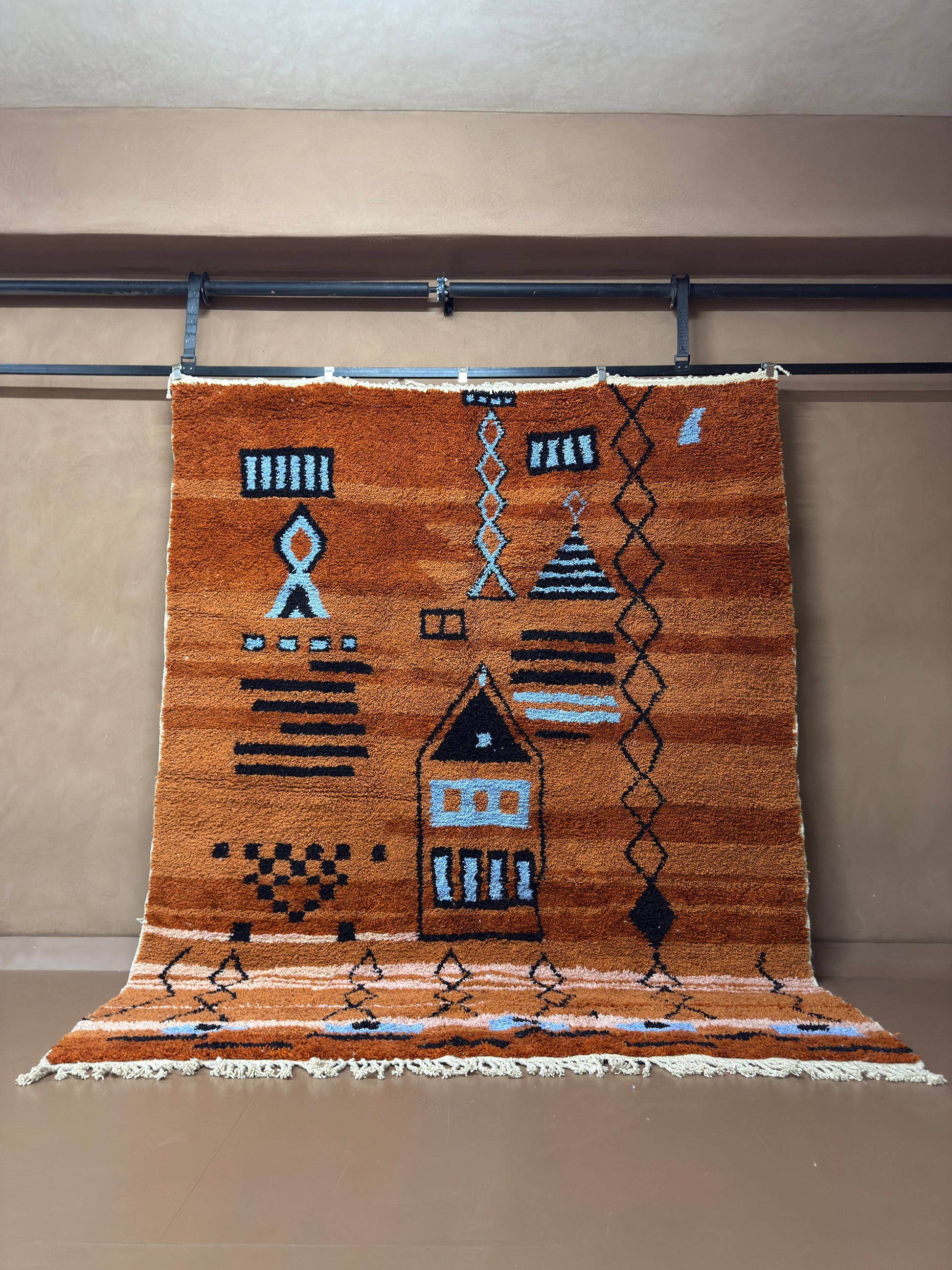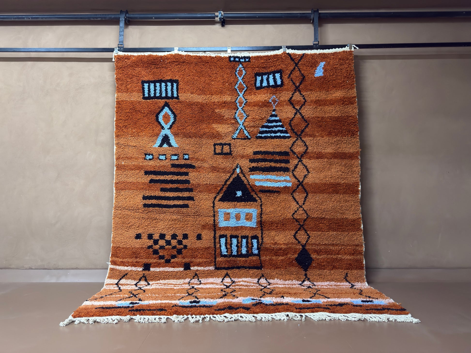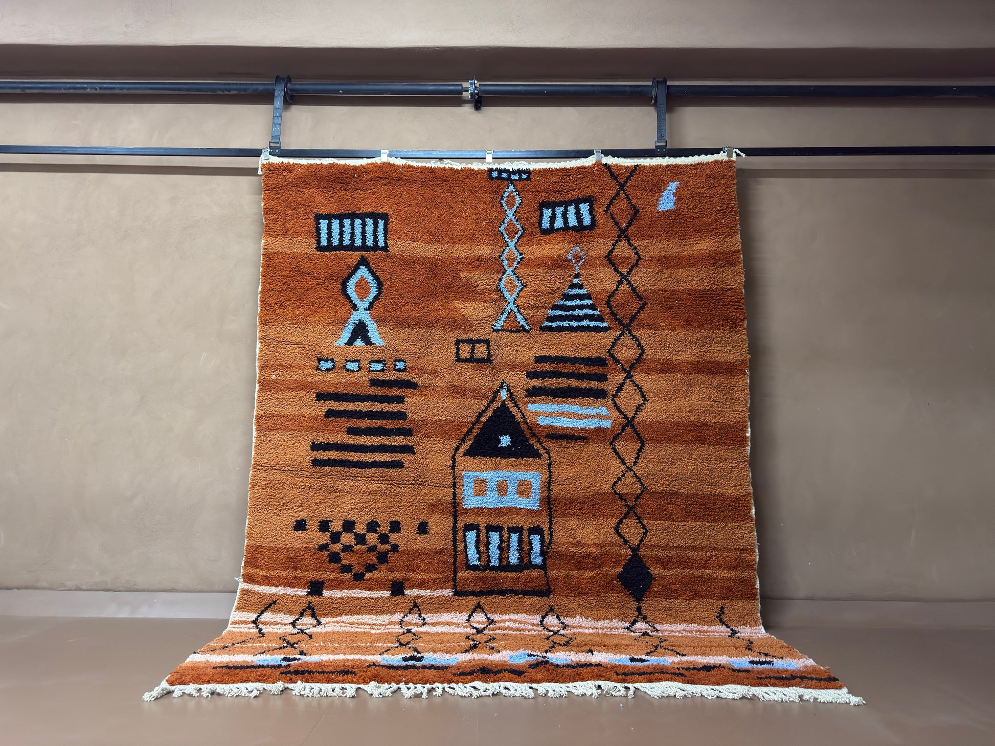 Bold, symbolic, and full of spirit, this custom Moroccan rug captures the essence of ancestral storytelling through artful motifs and geometric expression. With its handwoven illustrations and textured surface, it feels both rooted in tradition and refreshingly contemporary. The unique composition reflects a village narrative, making this piece not just a rug—but a statement of heritage and creativity.