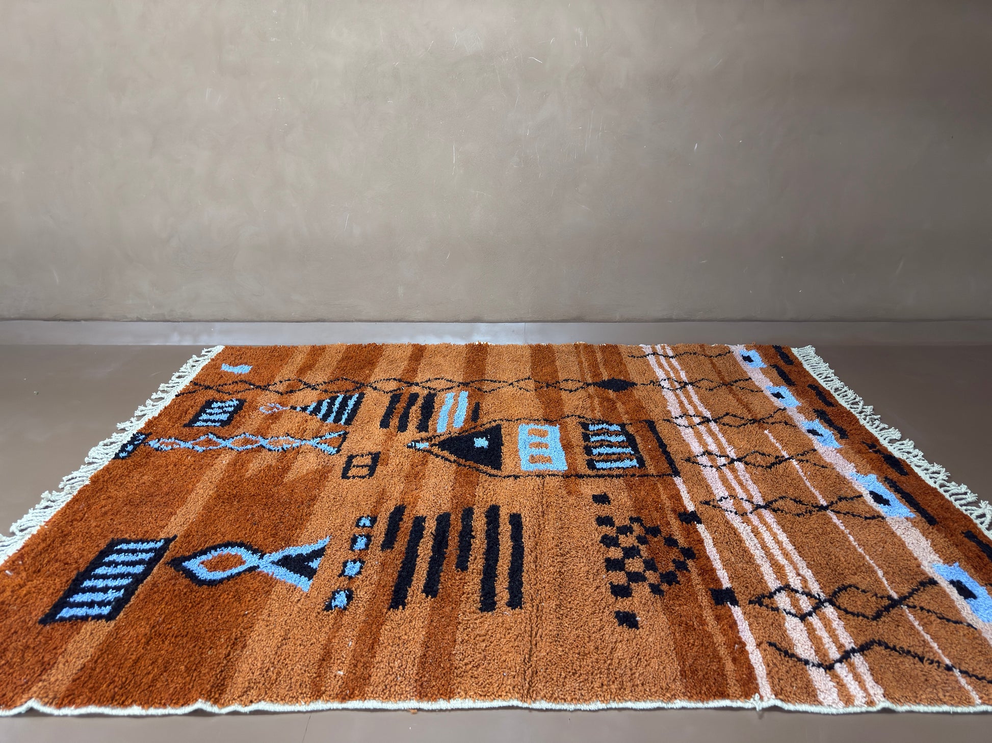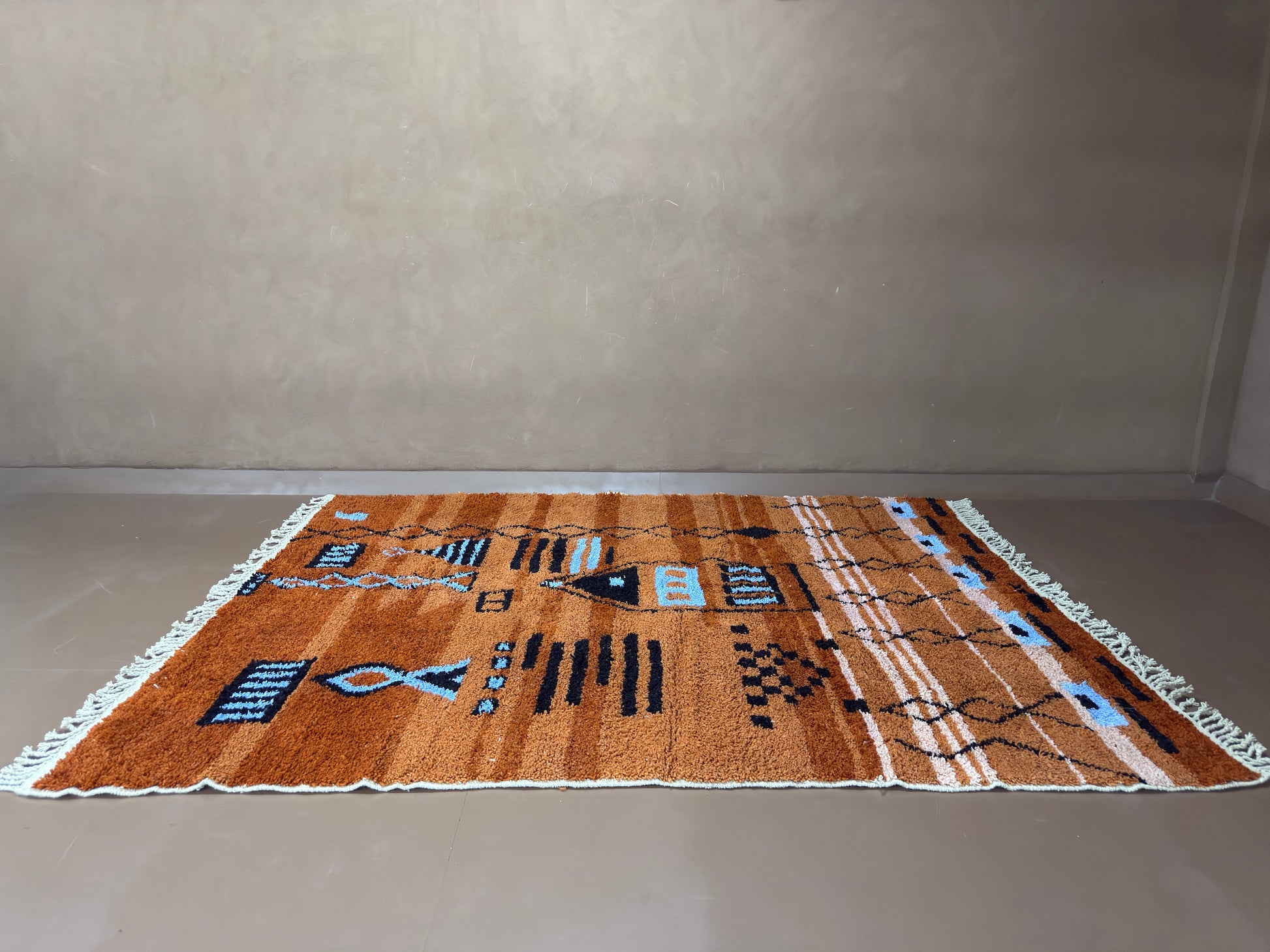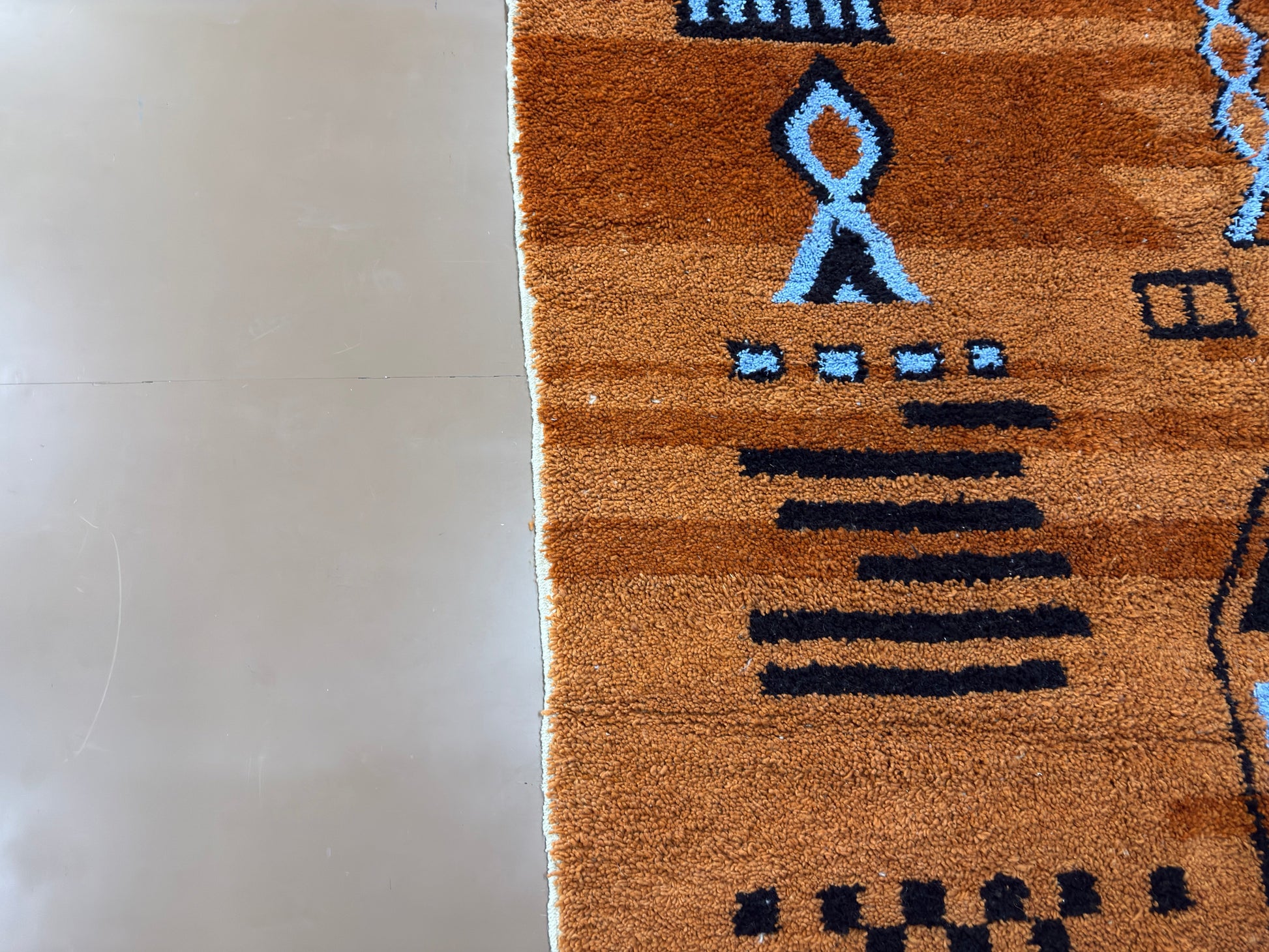 Bold, symbolic, and full of spirit, this custom Moroccan rug captures the essence of ancestral storytelling through artful motifs and geometric expression. With its handwoven illustrations and textured surface, it feels both rooted in tradition and refreshingly contemporary. The unique composition reflects a village narrative, making this piece not just a rug—but a statement of heritage and creativity.